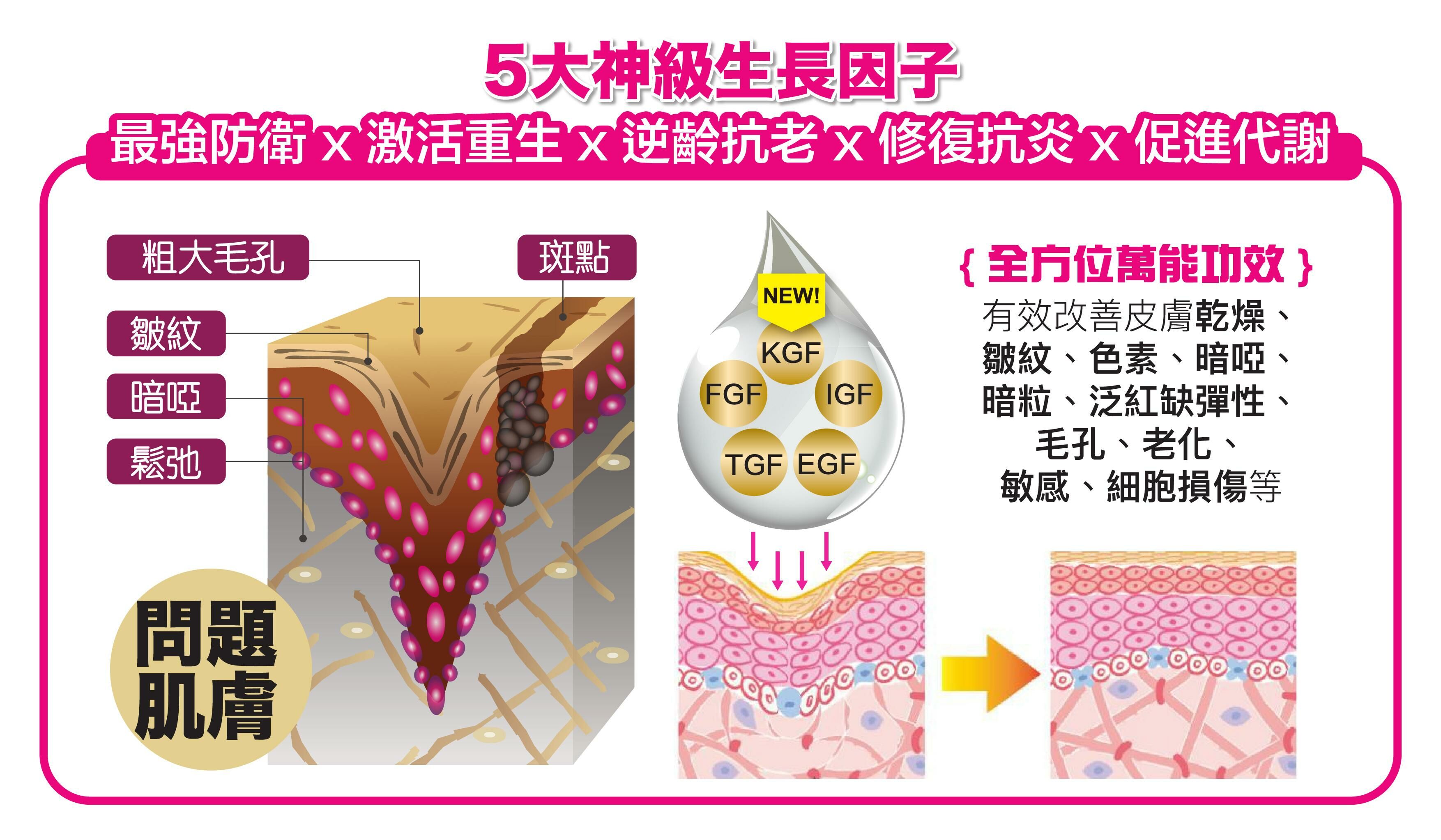 KGF(新增):最強角質代謝,促進肌膚角質生長,修復受損細胞,加速代謝及傷口癒合。