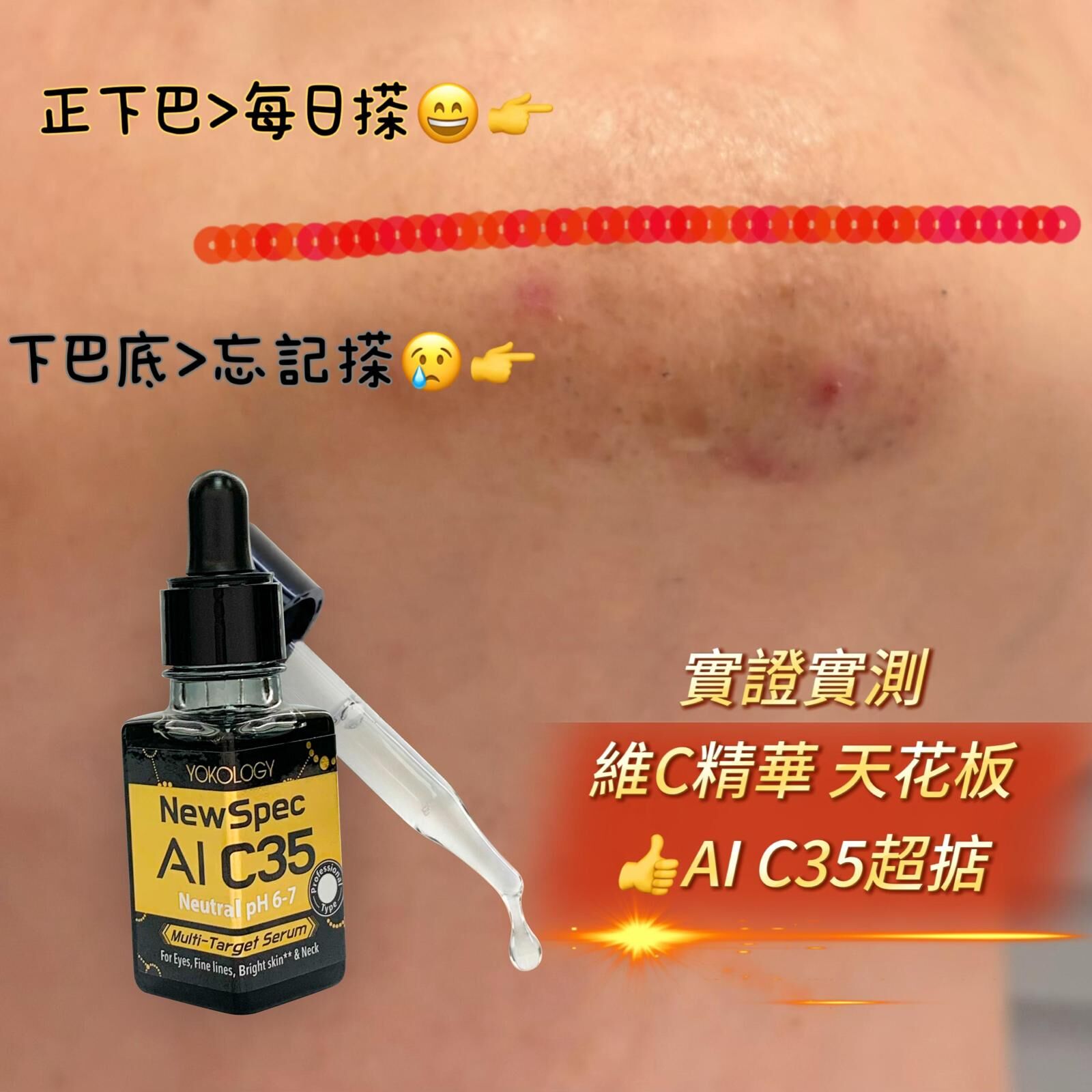 Yoko老公鬚根倒生致經常發炎,令黑色素沉澱,下巴位更經常爆瘡。自從用了AI C35,九成痊癒修復,光滑白淨,但下巴底因被忽略,沒有使用AI C35,所以黑色素積聚兼持續生瘡。