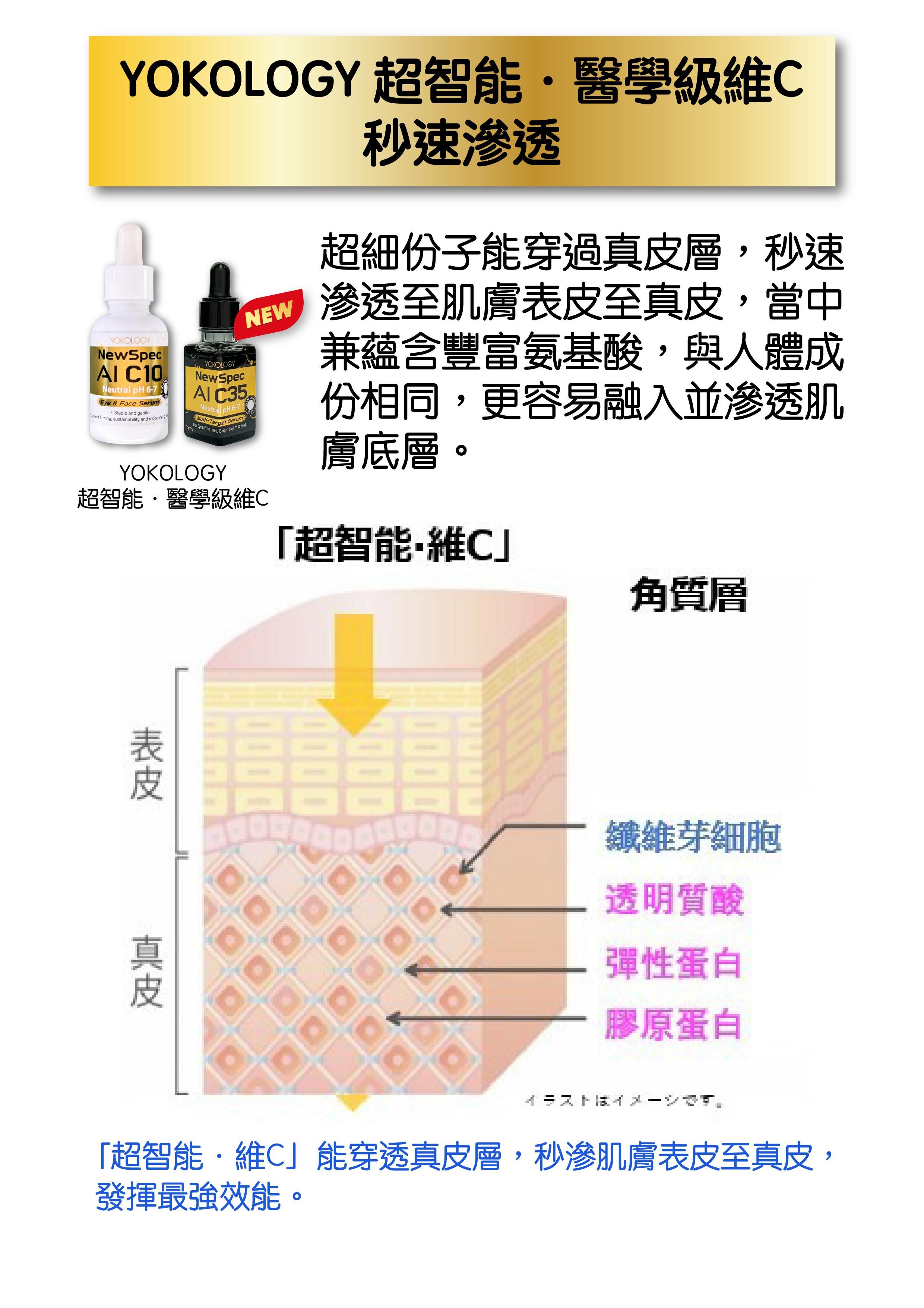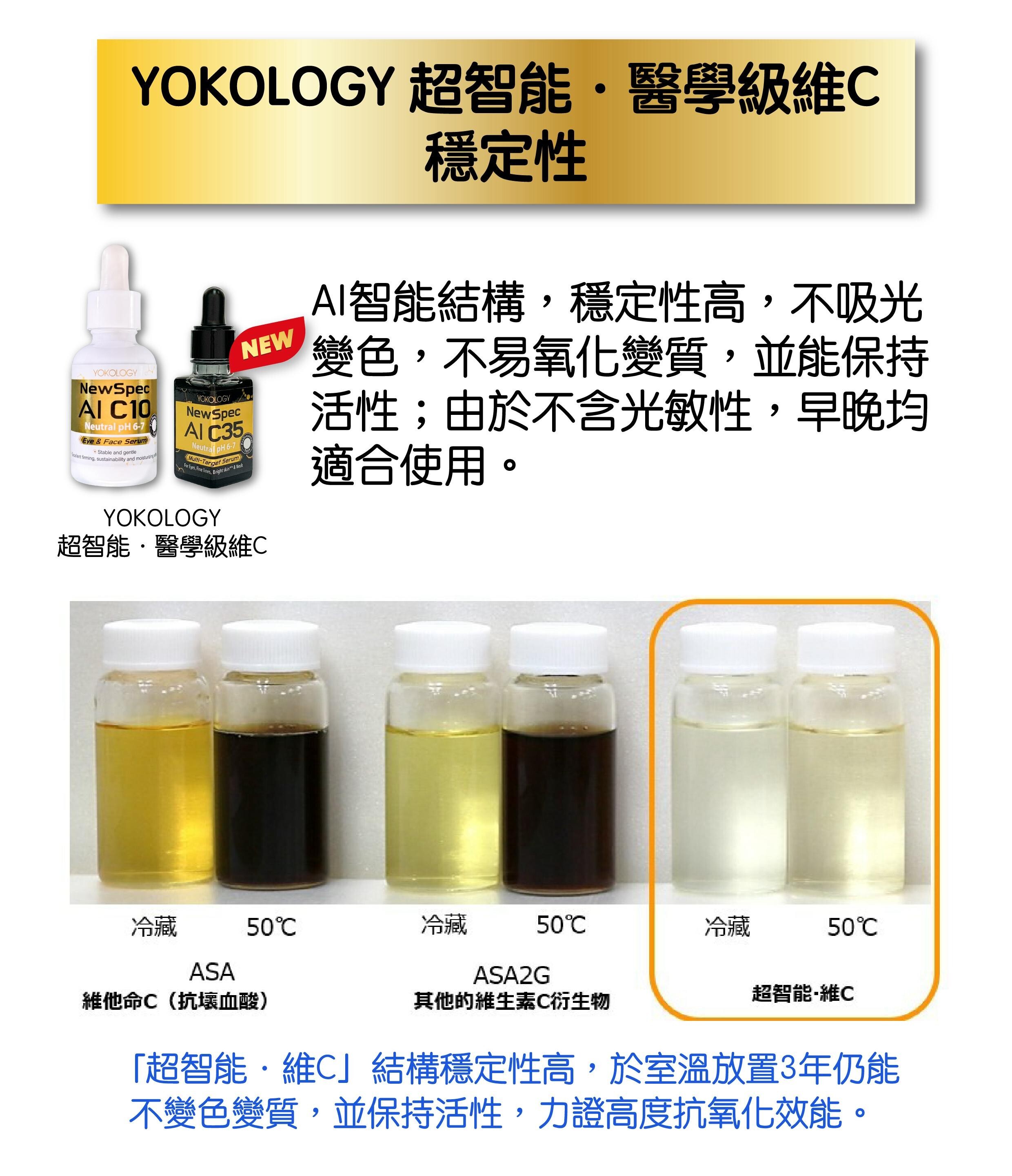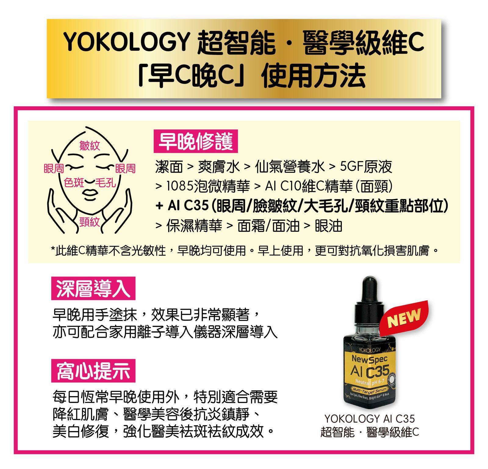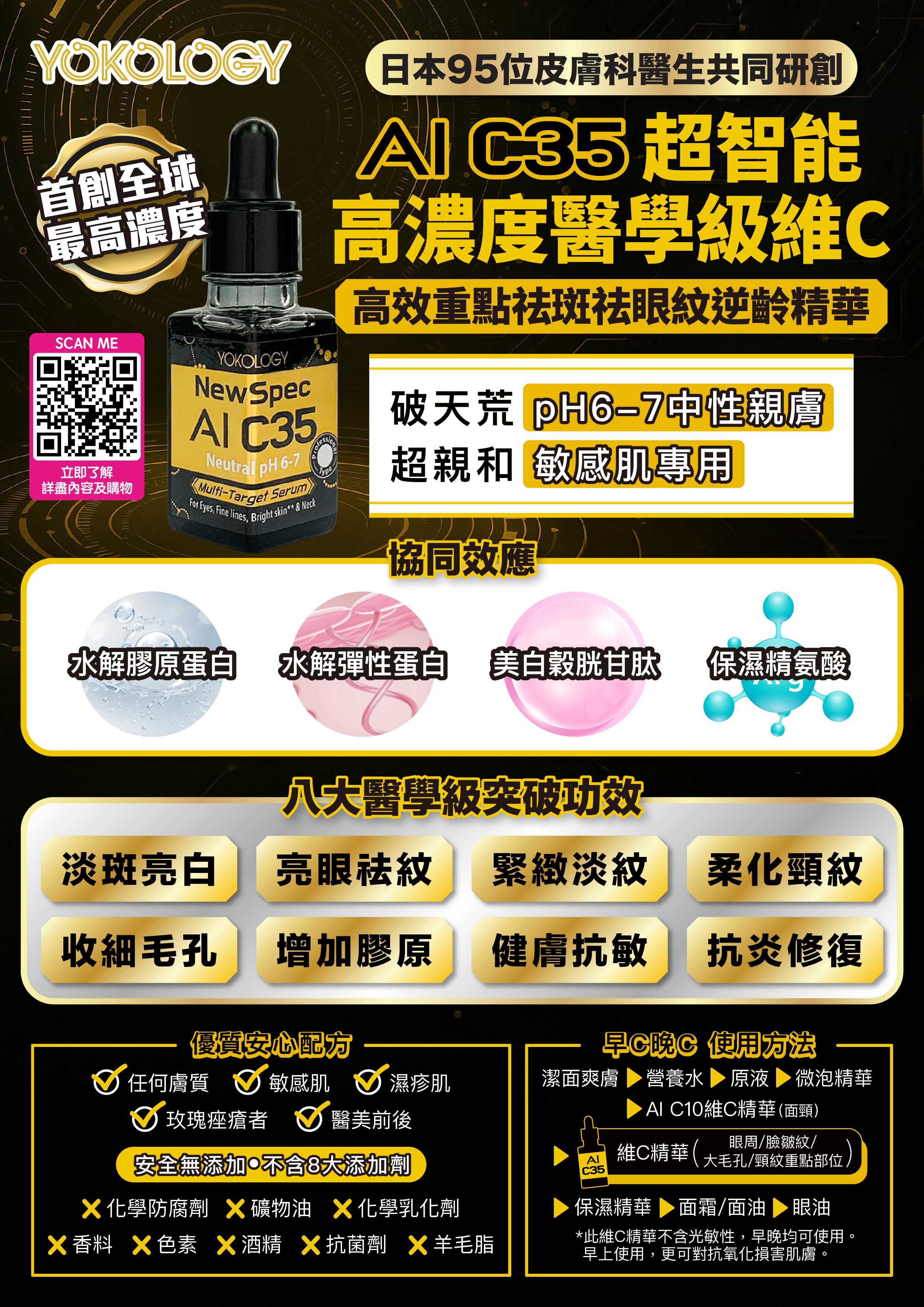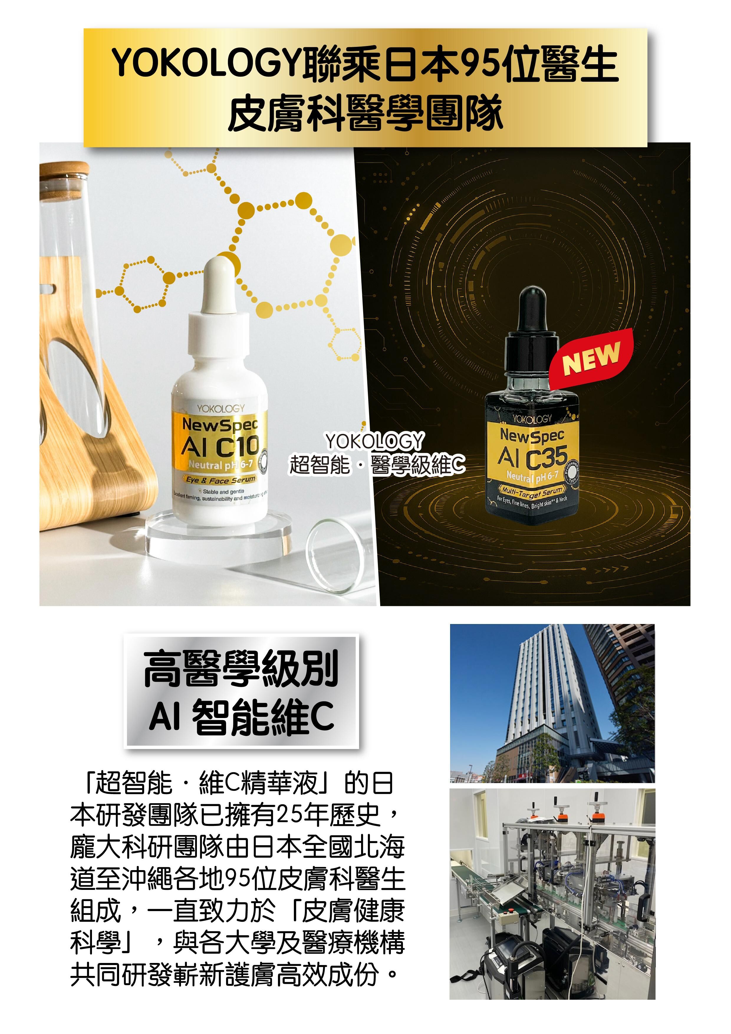 YOKOLOGY繼突破性的AI C10「超智能‧維C」面眼頸精華液後,再度聯同日本95位皮膚科醫生專家成功研創出突破傳統、顛覆市場的未來型超智能維C精華──AI C35「超智能‧高濃度醫學級維C」高效重點祛斑祛紋逆齡精華,成為破天荒新世代全球最高濃度。