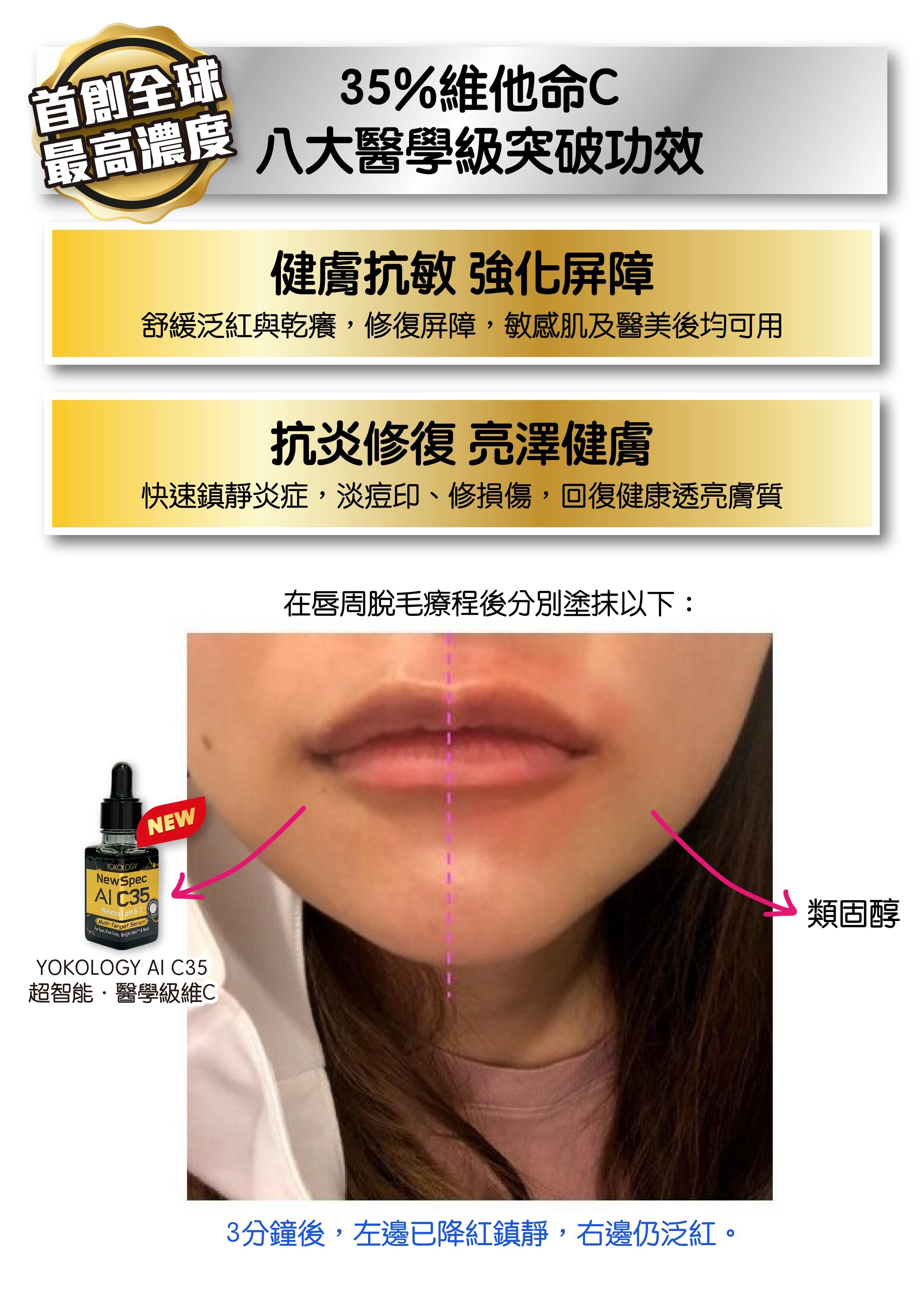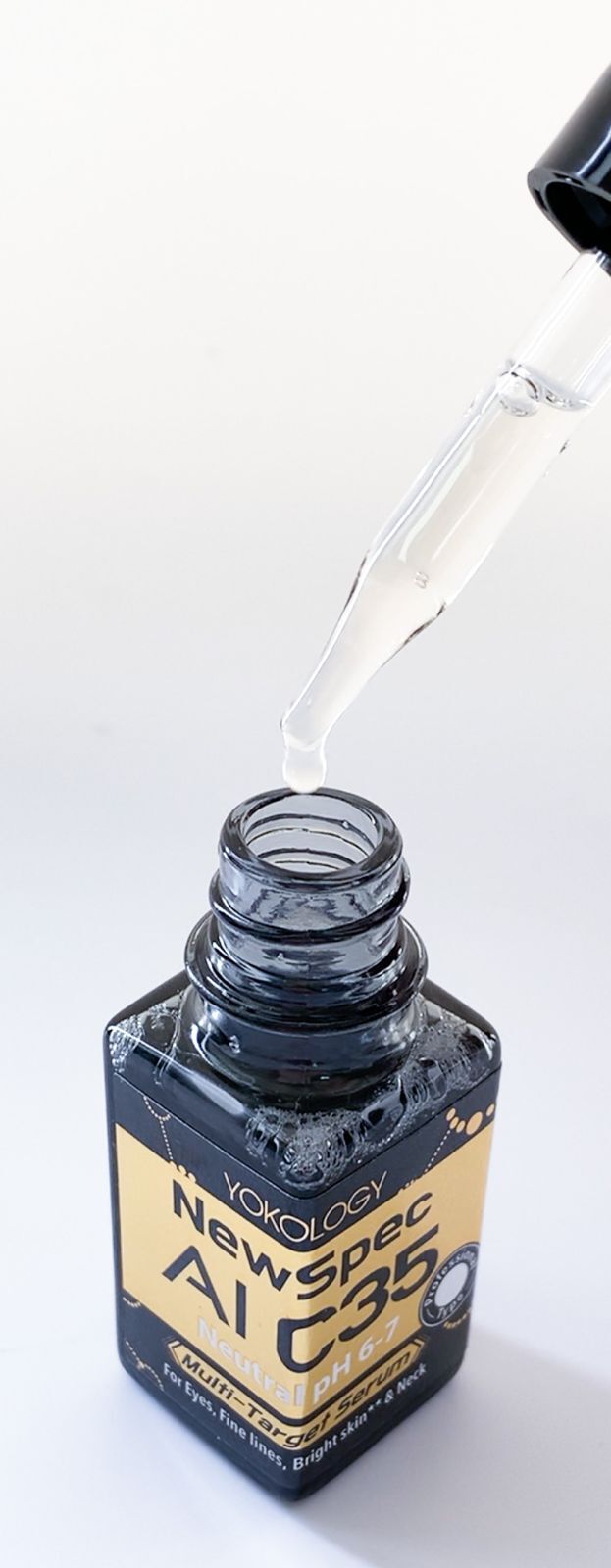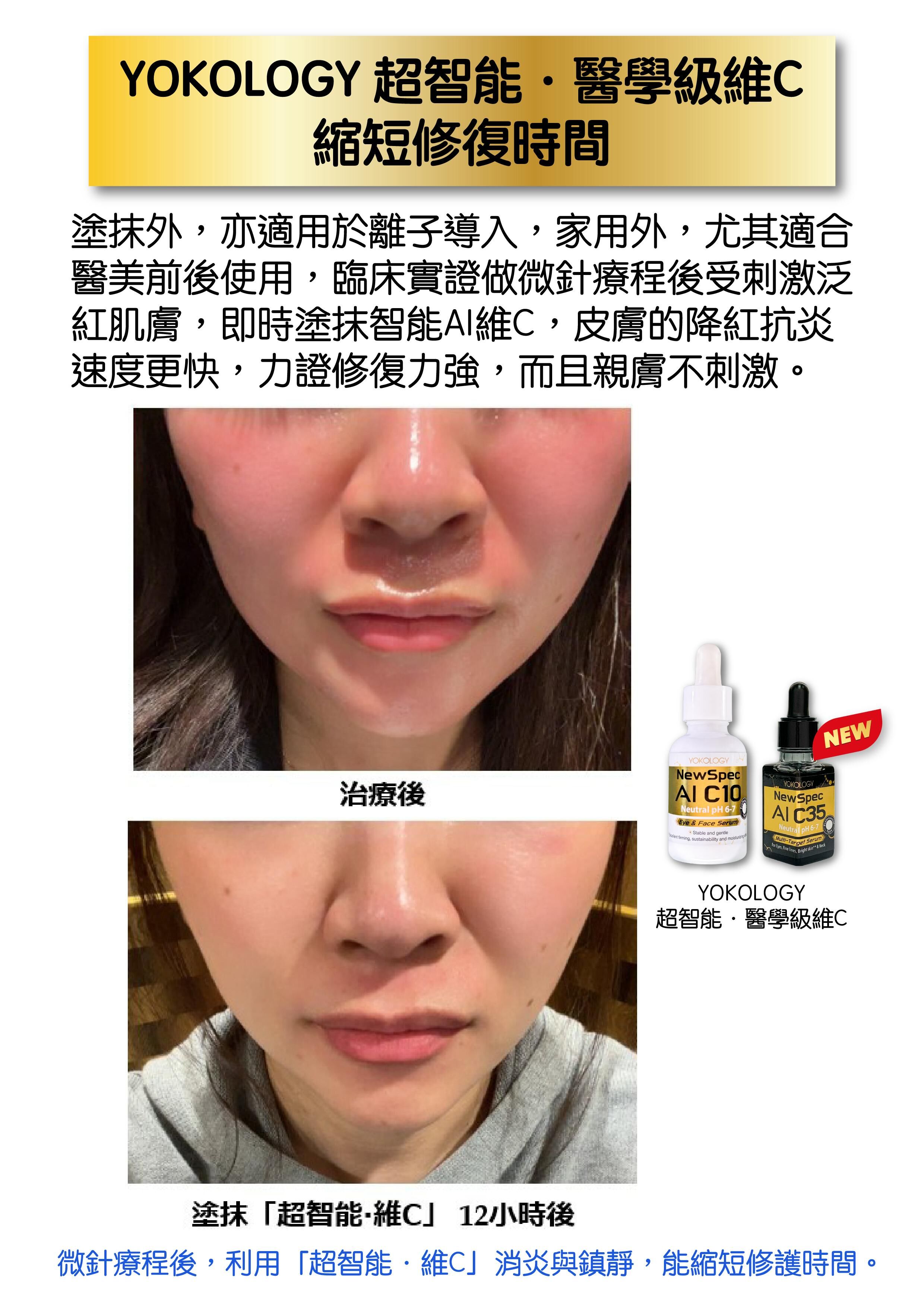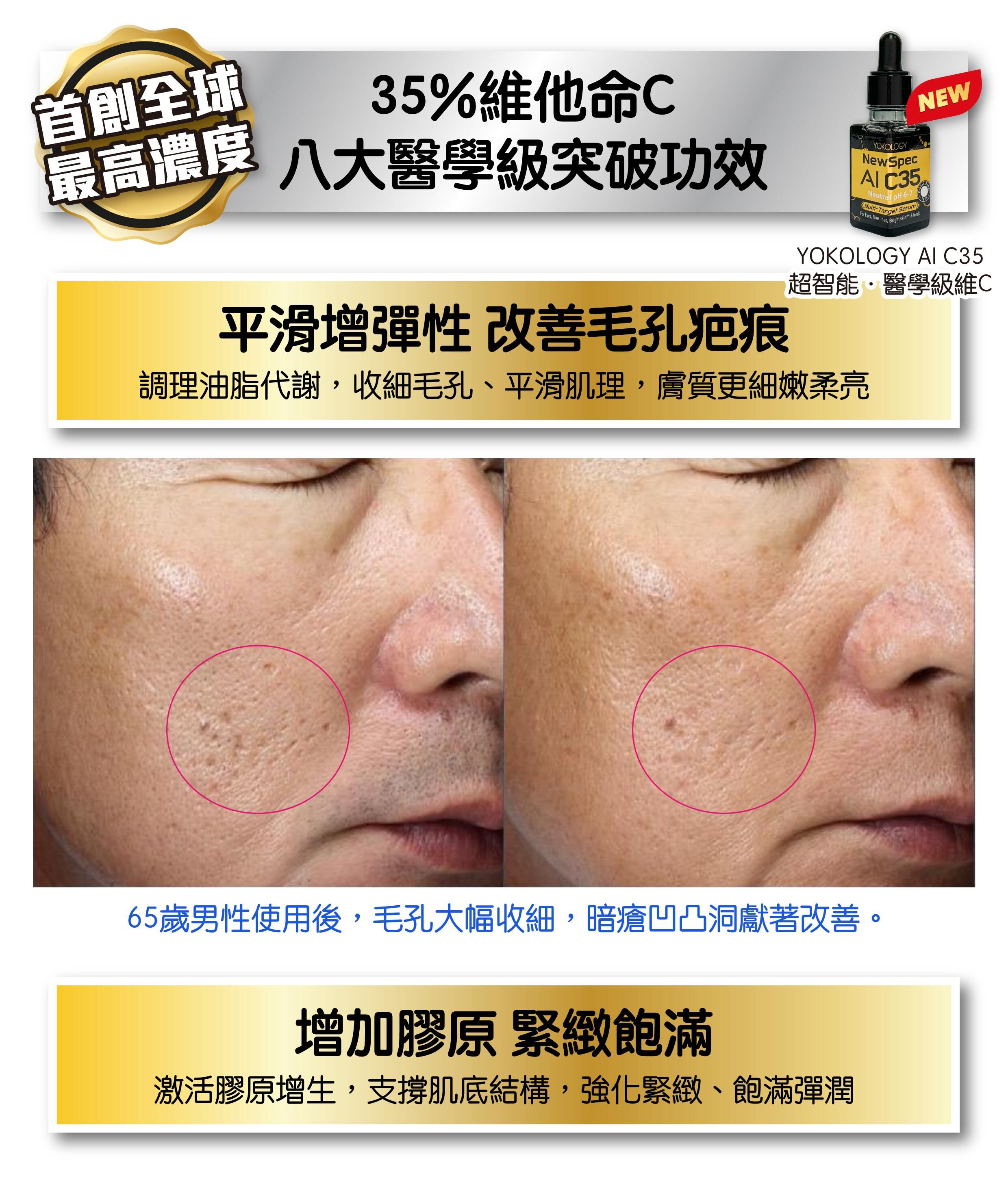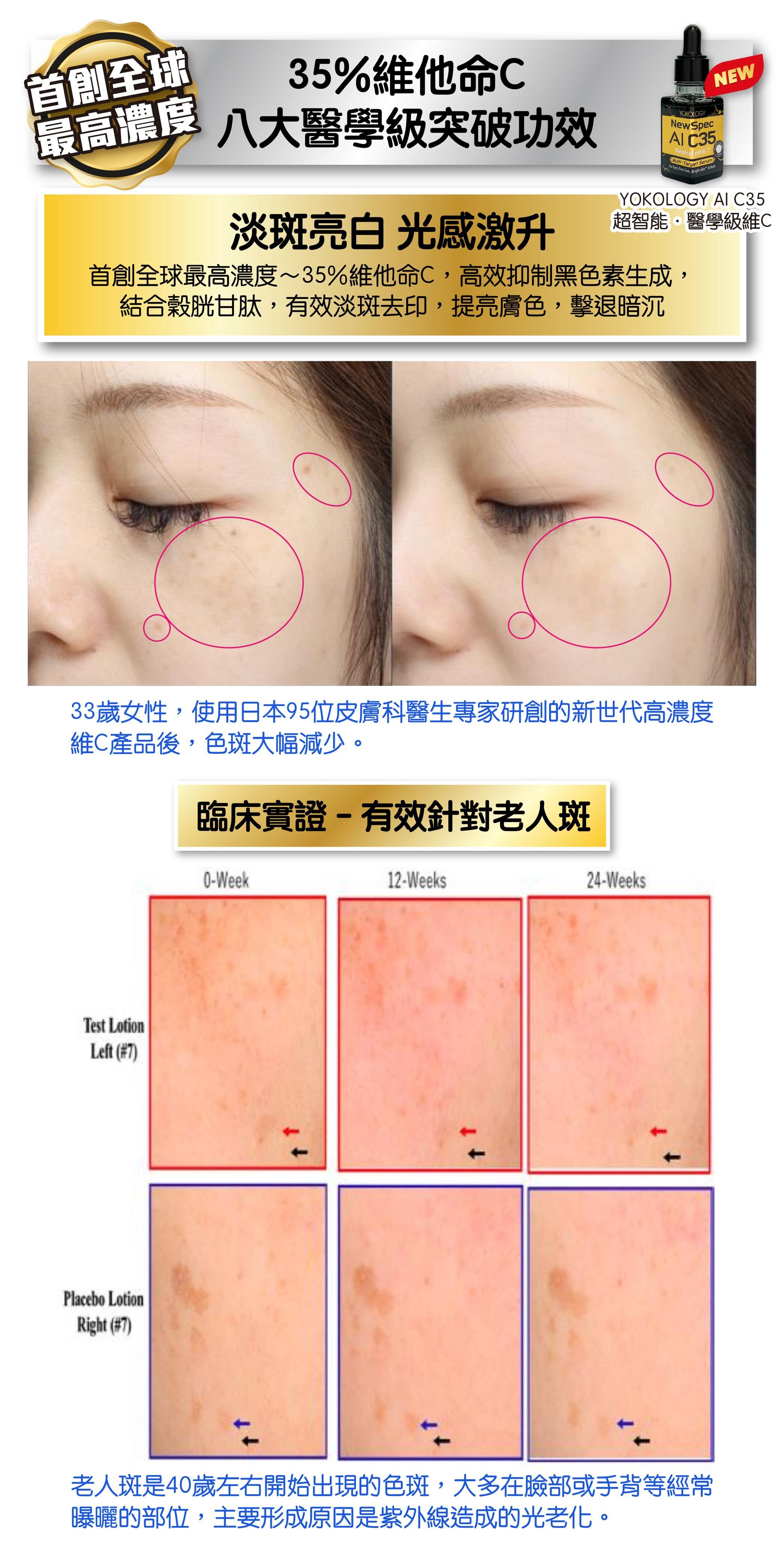 YOKOLOGY繼突破性的AI C10「超智能‧維C」面眼頸精華液後,再度聯同日本95位皮膚科醫生專家成功研創出突破傳統、顛覆市場的未來型超智能維C精華──AI C35「超智能‧高濃度醫學級維C」高效重點祛斑祛紋逆齡精華,成為破天荒新世代全球最高濃度。