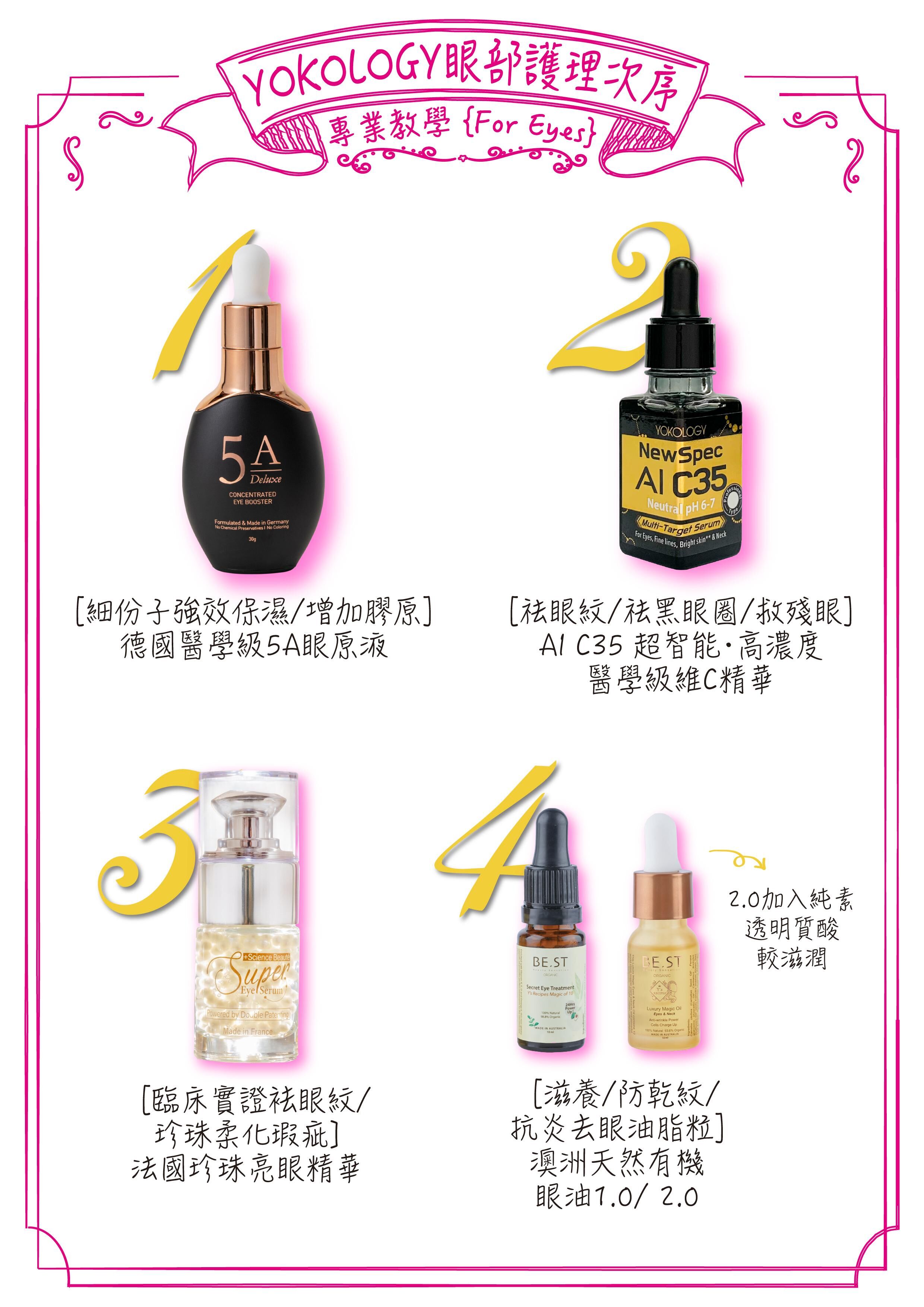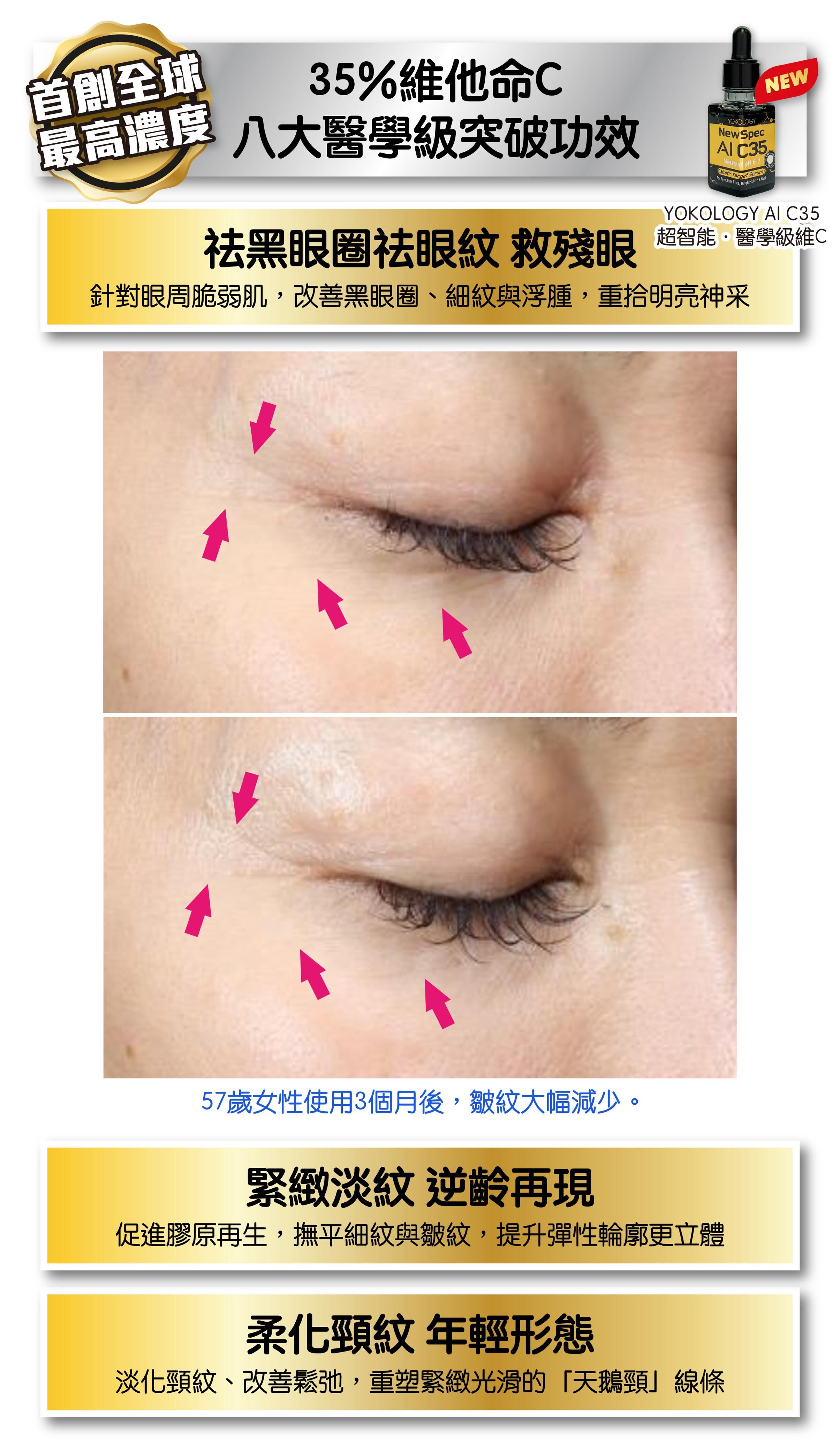 眼周是最易衰老部位,「AI C35 超智能‧高濃度醫學級維C」是專門針對眼部脆弱位置研創,結合小份子水解膠原蛋白和彈性蛋白,有效撫平眼周乾紋、細紋、淡黑眼圈、緊致眼袋,回復明亮年輕眼周!
