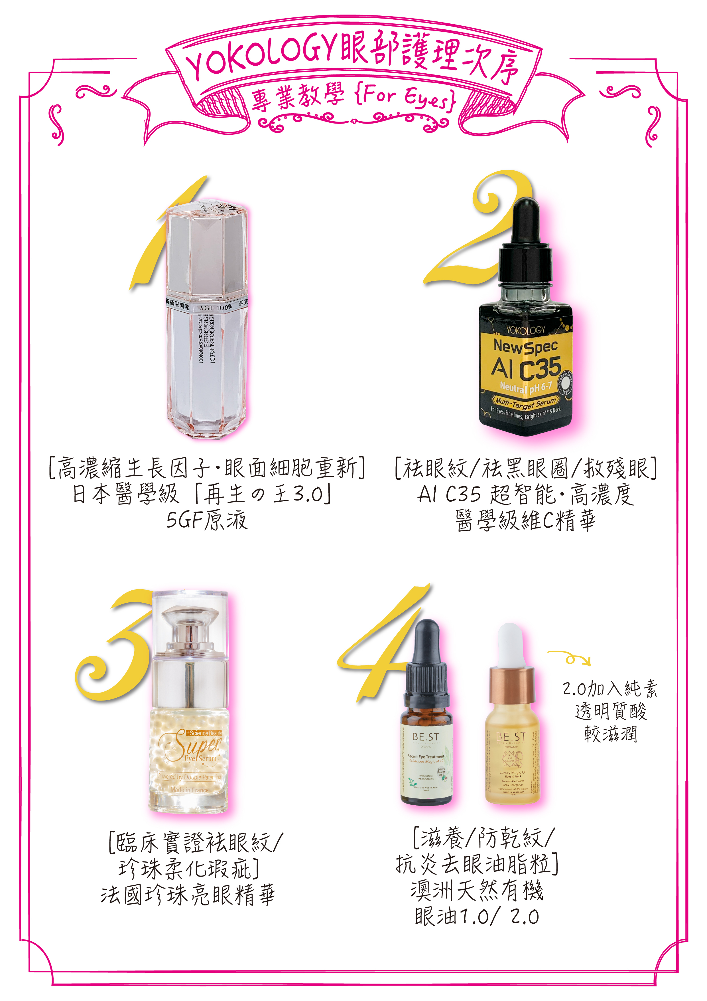 1. 淡斑亮白 2. 亮眼祛紋 3. 緊緻淡紋