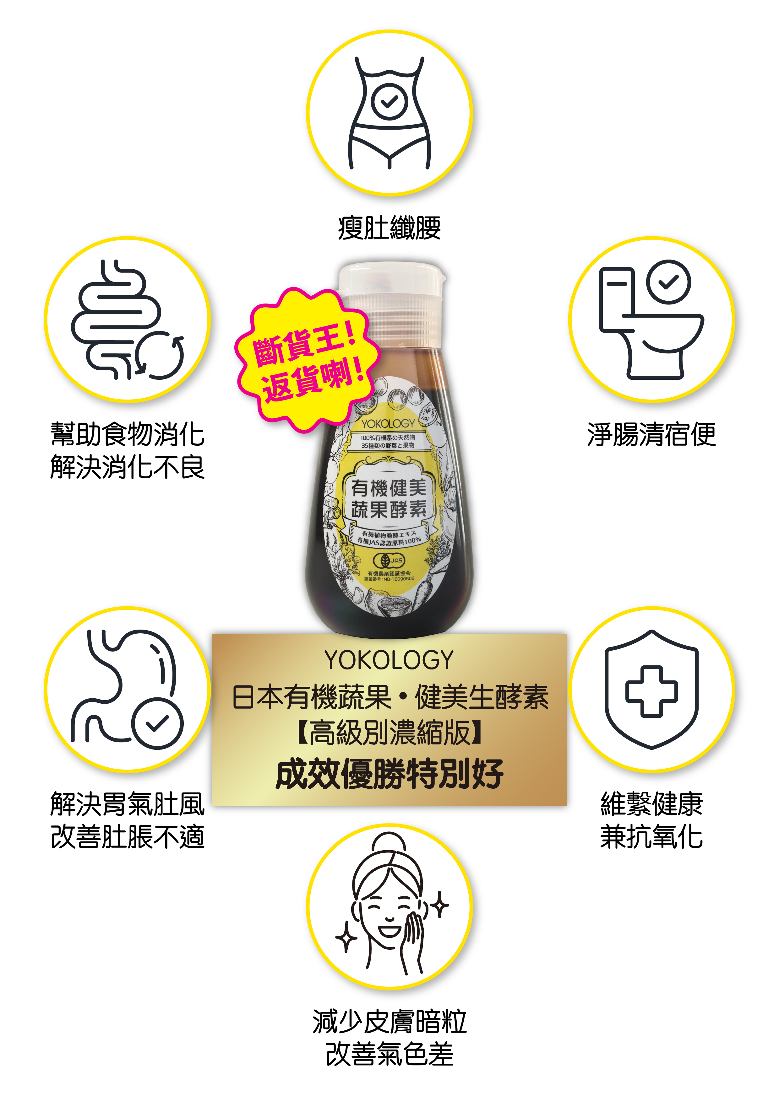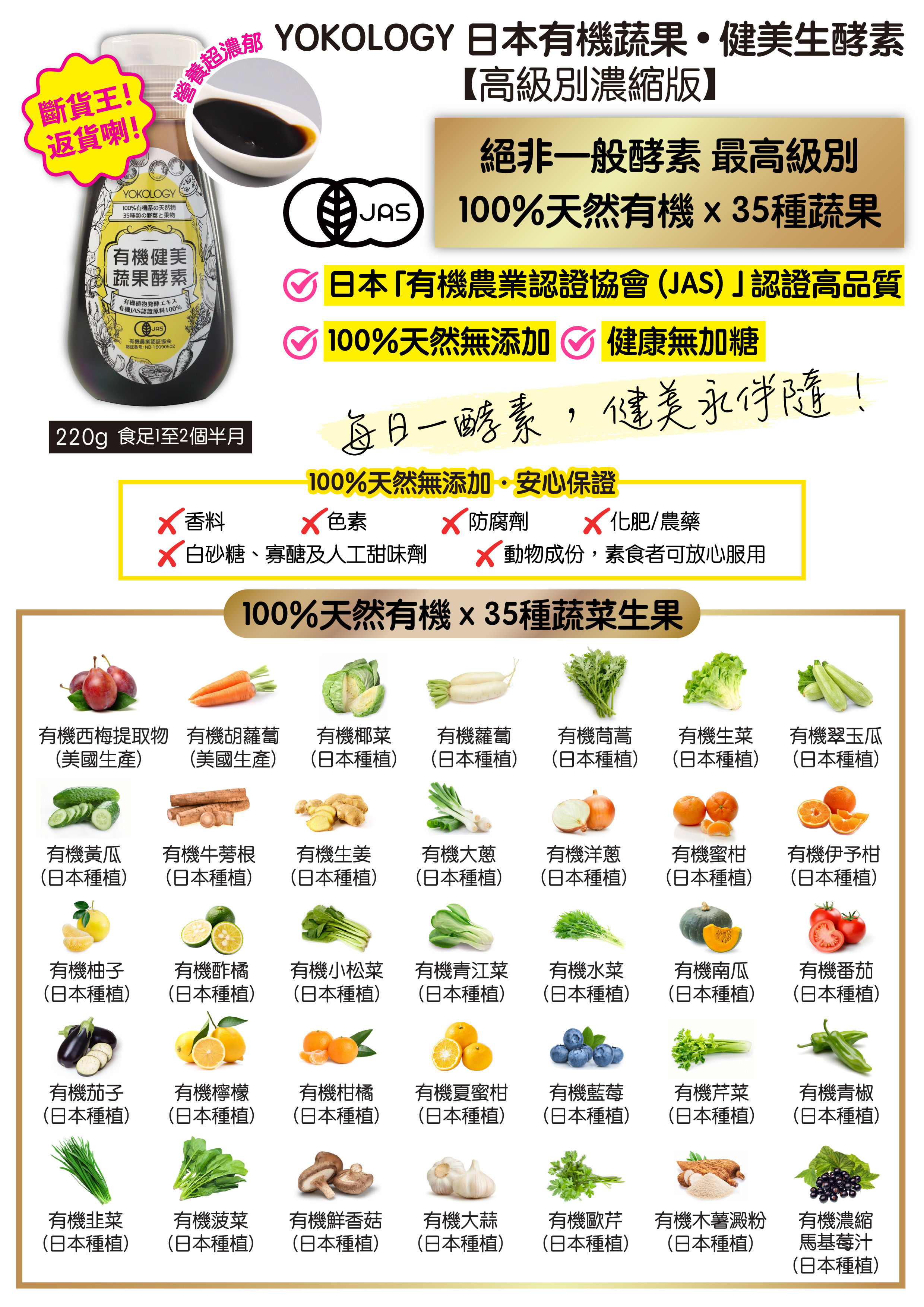YOKOLOGY「日本有機蔬果‧健美生酵素」-日本20年歷史大廠,自設農場監控,匯聚35種日本產嚴選蔬果精華,將新鮮蔬果的營養成份濃縮成超級健康的「頂級生酵素膏」,100%有機純天然,日本製造,並獲「有機農業認證(JAS)」認證高品質。