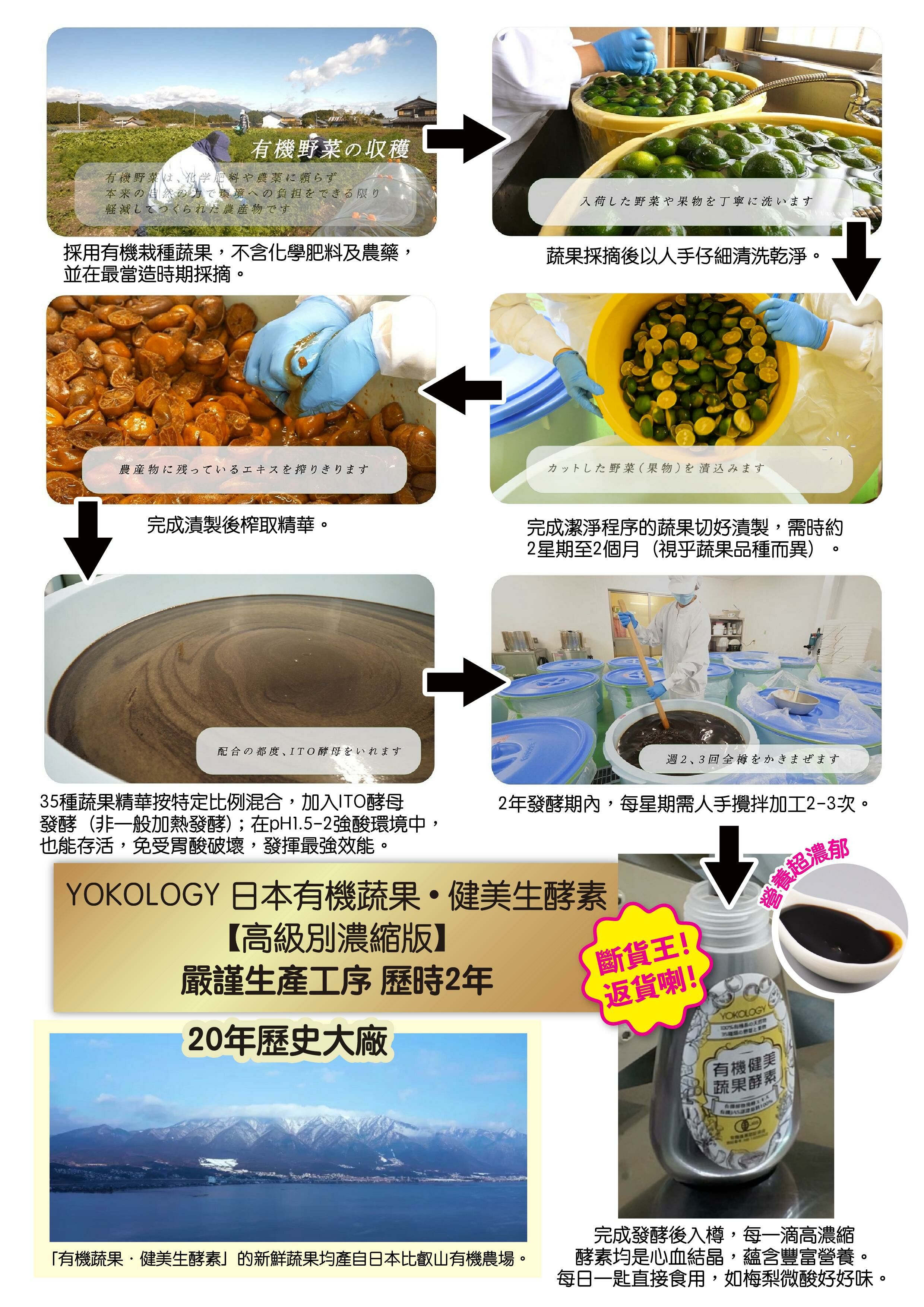「有機蔬果‧健美生酵素」由日本擁有近20年歷史的優質工廠製造,亦是該日本廠方首次與國外品牌合作,專業嚴謹的理念與YOKOLOGY的品牌宗旨如出一轍,因而促成是次合作,確是YOKOLOGY榮幸!