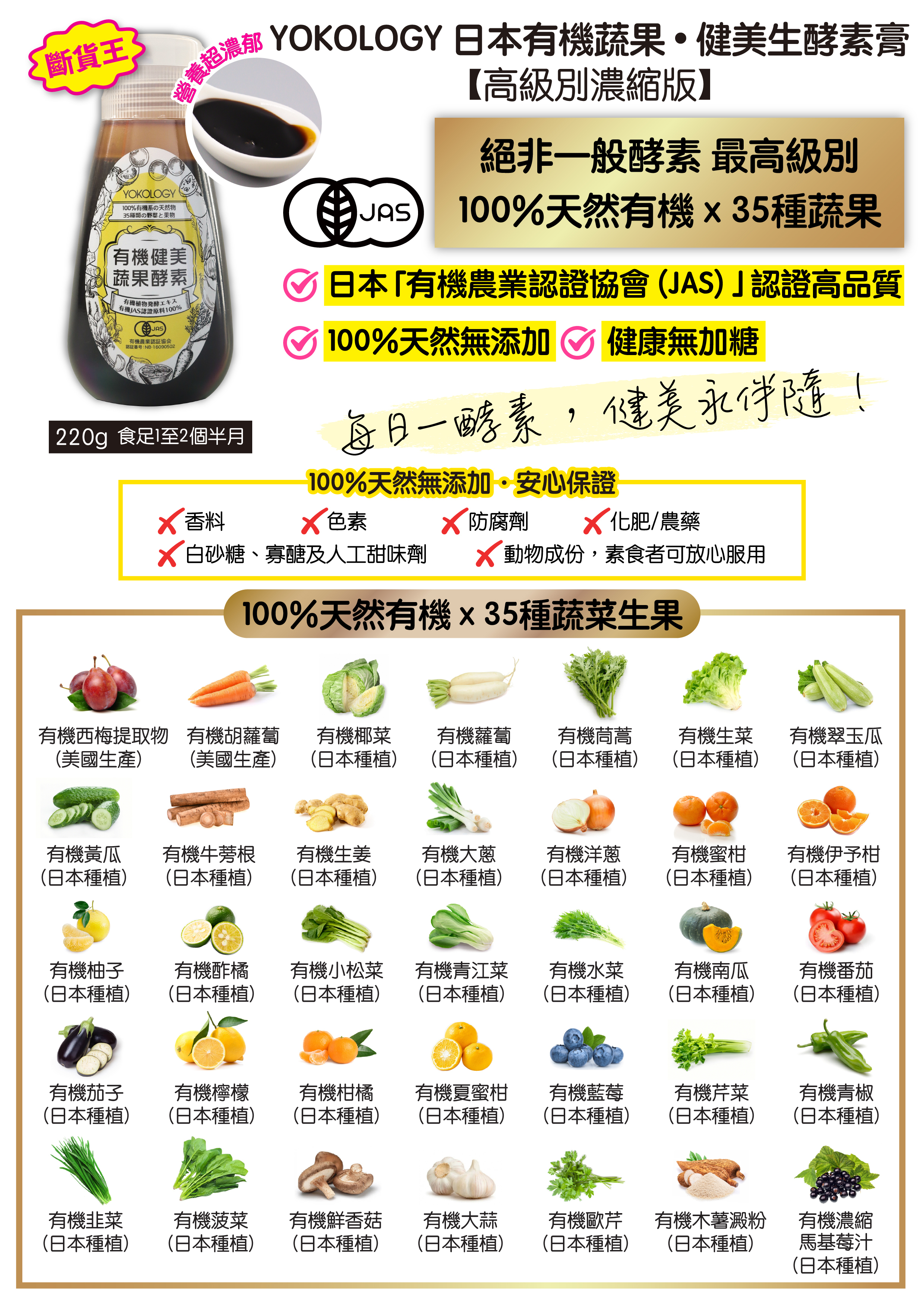 YOKOLOGY「日本有機蔬果‧健美生酵素膏」-日本20年歷史大廠,自設農場監控,匯聚35種日本產嚴選蔬果精華,將新鮮蔬果的營養成份濃縮成超級健康的「頂級生酵素膏」,100%有機純天然,日本製造,並獲「有機農業認證(JAS)」認證高品質。