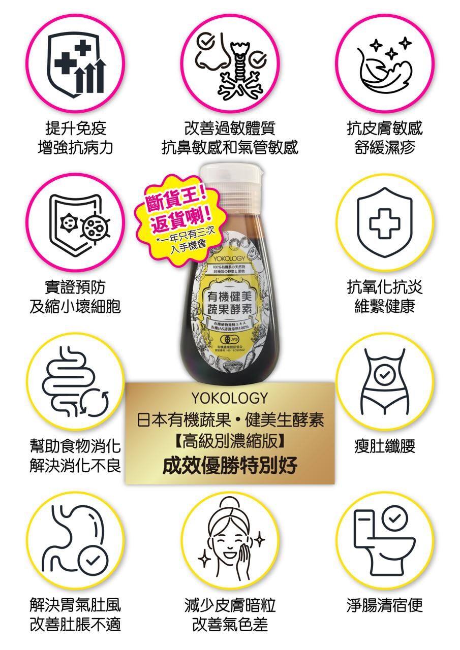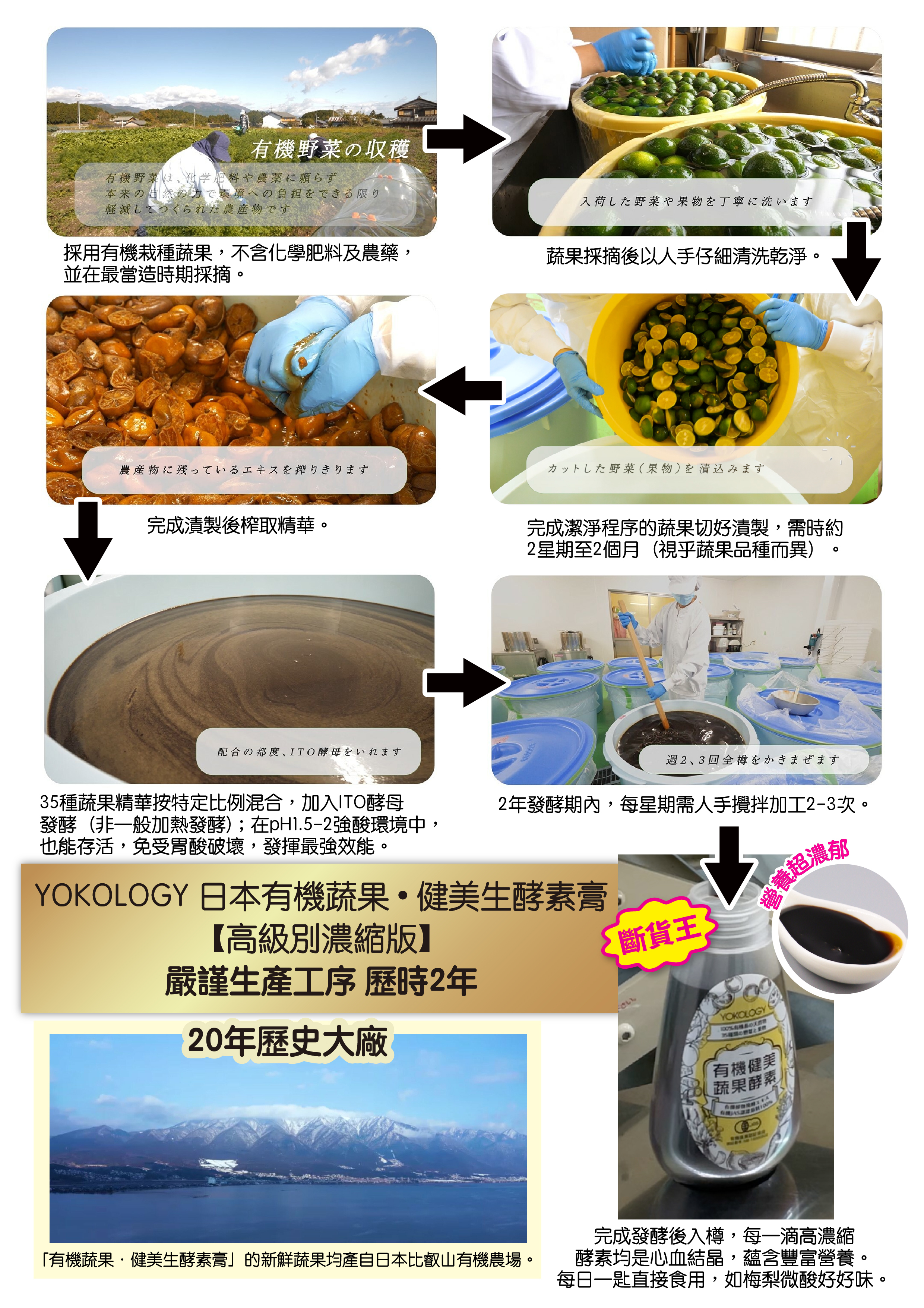 「有機蔬果‧健美生酵素膏」由日本擁有近20年歷史的優質工廠製造,亦是該日本廠方首次與國外品牌合作,專業嚴謹的理念與YOKOLOGY的品牌宗旨如出一轍,因而促成是次合作,確是YOKOLOGY榮幸!