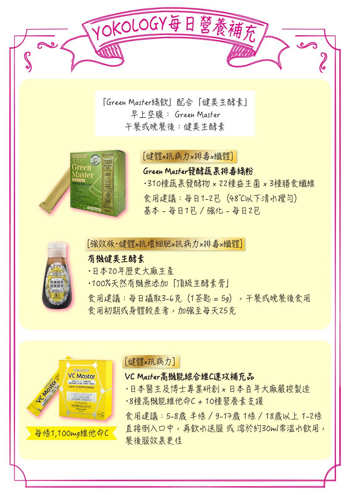 Yoko有個很好的養生習慣,每朝一杯~飲用蔬果綠粉逾10年,一直希望找到完美的多效合一好物;所以,矢志推出合符所有高規格要求的蔬果排毒飲,最終花了3年時間和日本養生專家團隊研發 ── 一年籌劃,一年試驗,再以一年生產,「335 Green Master」終於成功面世。這次亦是繼「日本有機蔬果•健美生酵素」後,再度與擁有近20年歷史的日本廠方聯手,其專業嚴謹的理念與YOKOLOGY的品牌宗旨如出一轍,促成了再一次合作,共同研發出高品質的「335 Green Master發酵蔬果綠粉」,突破傳統,努力邁向市場王者地位。