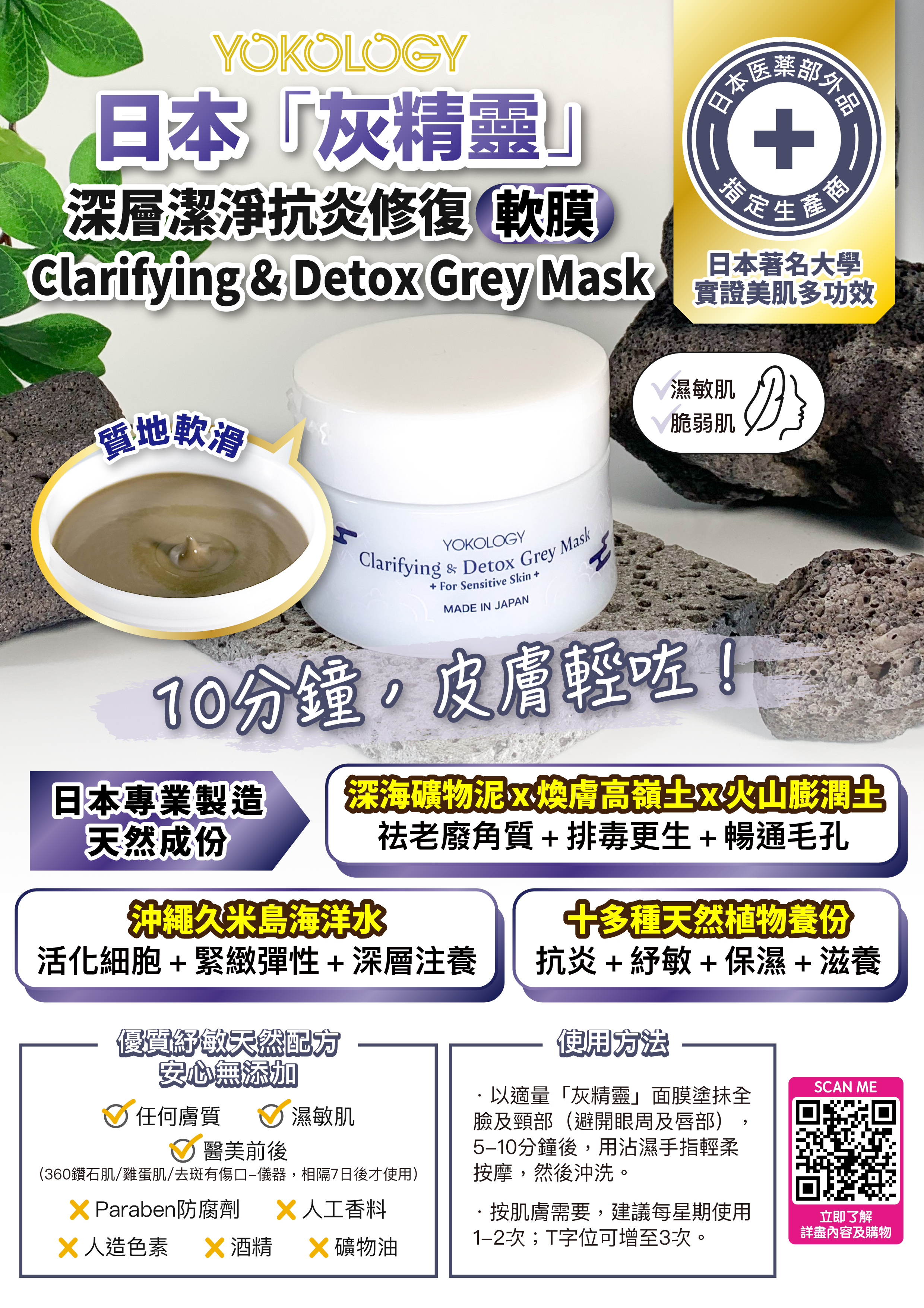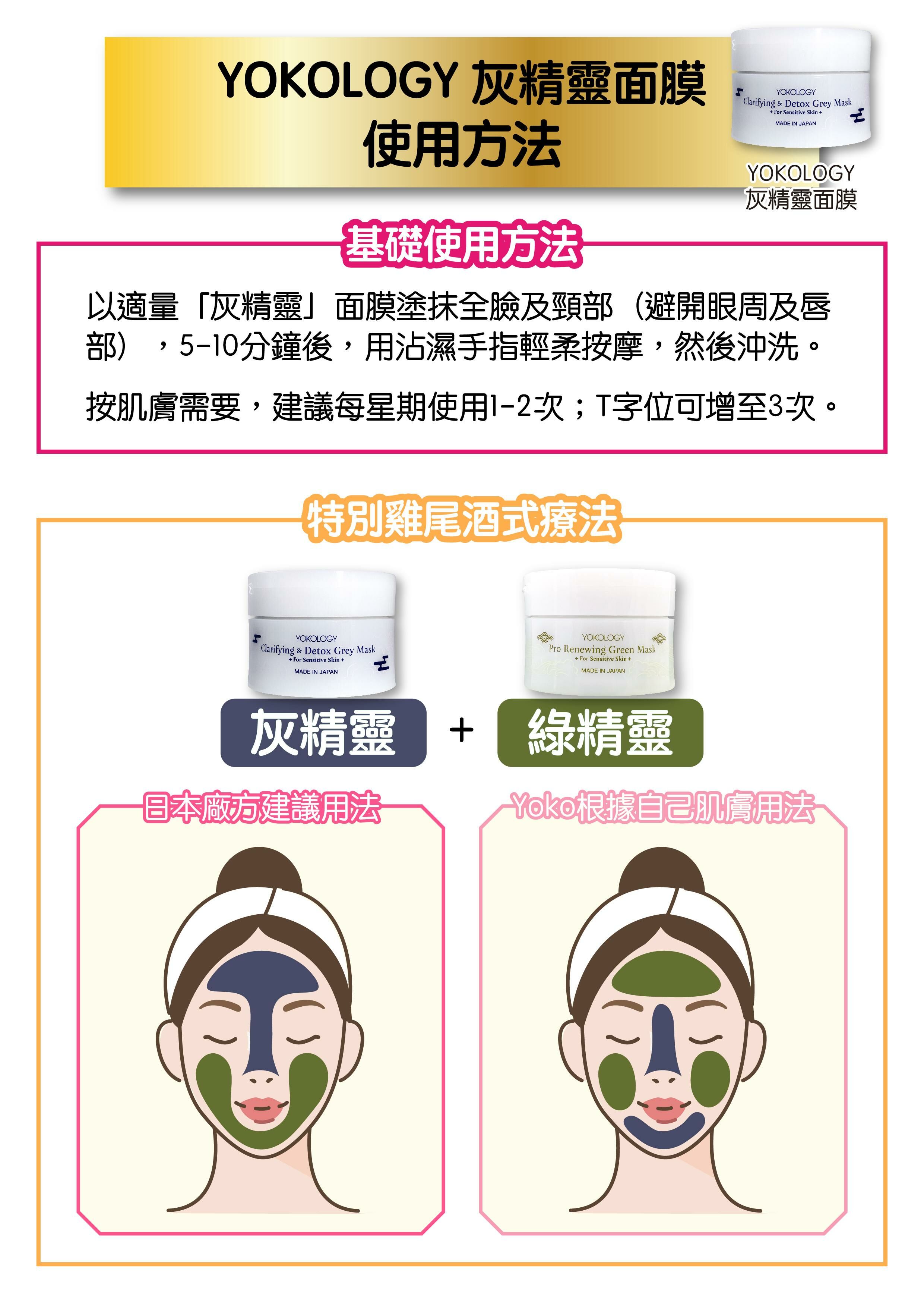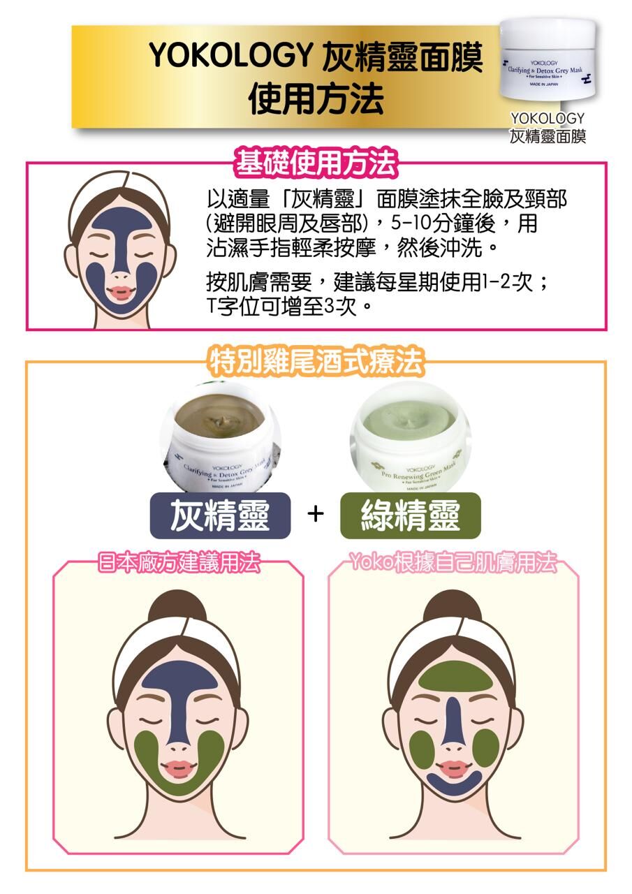 YOKOLOGY「灰精靈」深層潔淨抗炎修復軟泥膜Grey Mask,與早前推出的同系列「綠精靈」Green Mask,均由日本沖繩著名醫藥部外品製造商研發生產。「灰精靈」的天然配方採用大學實證高效抗衰老的全天然沖繩久米島海洋水外,更特別嚴選三種富含礦物質的軟泥膜成份──沖繩深海礦物泥、美國煥膚高嶺土、萬年火山膨潤土,再配合十多種天然植物養份,突破軟滑質感,敷上絕不繃緊。