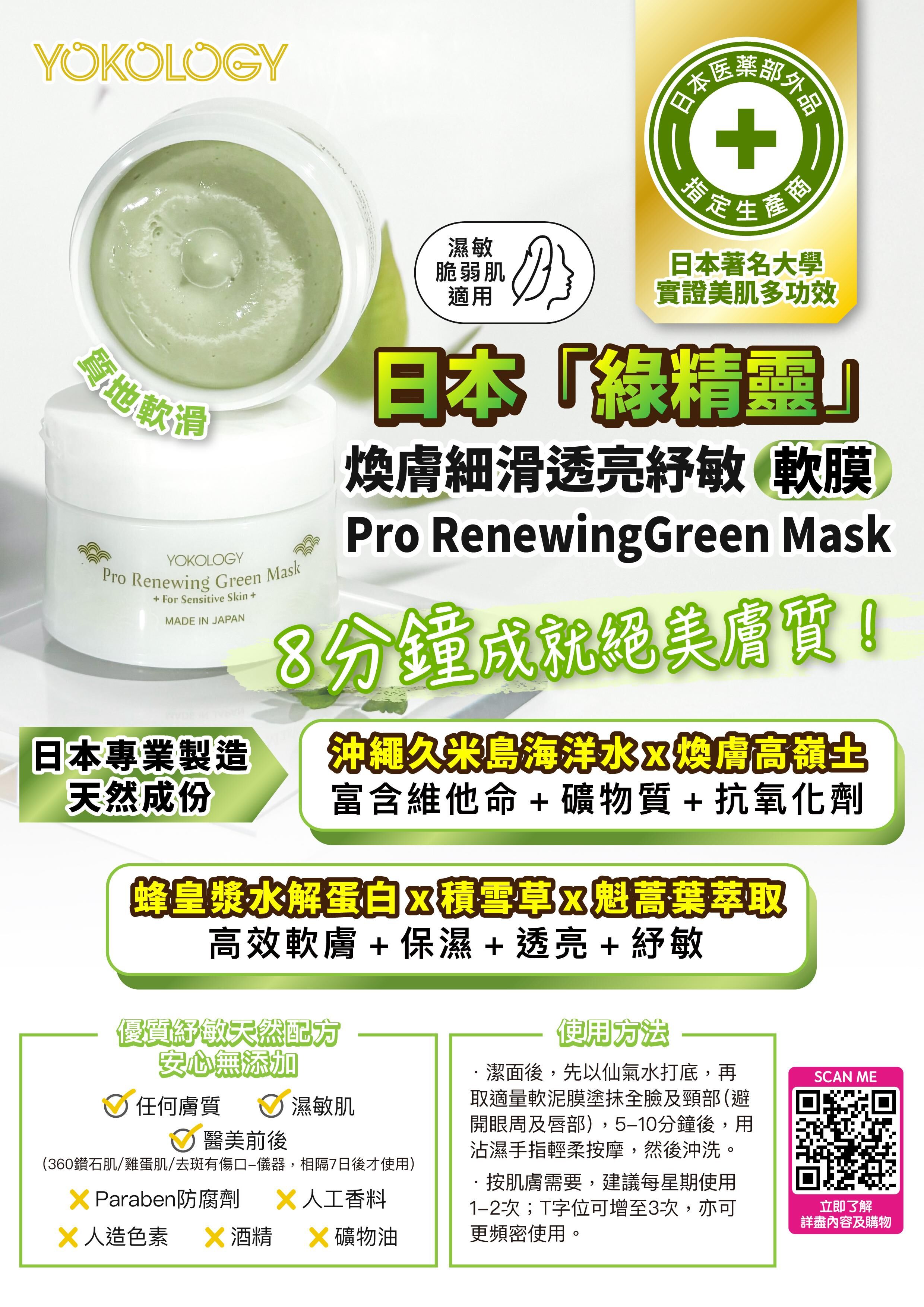 YOKOLOGY「綠精靈」煥膚細滑透亮紓敏軟泥膜,由日本沖繩著名醫藥部外品製造商研發生產,利用全天然沖繩久米島海洋水及美國高嶺土,配合蜂皇漿水解蛋白、積雪草、魁蒿葉萃取等多種天然紓敏煥膚成份。
