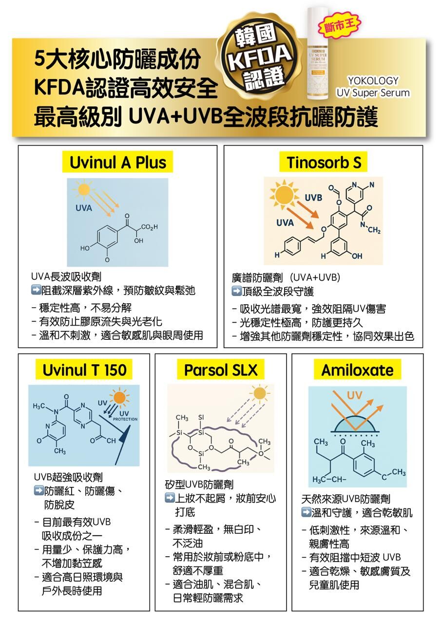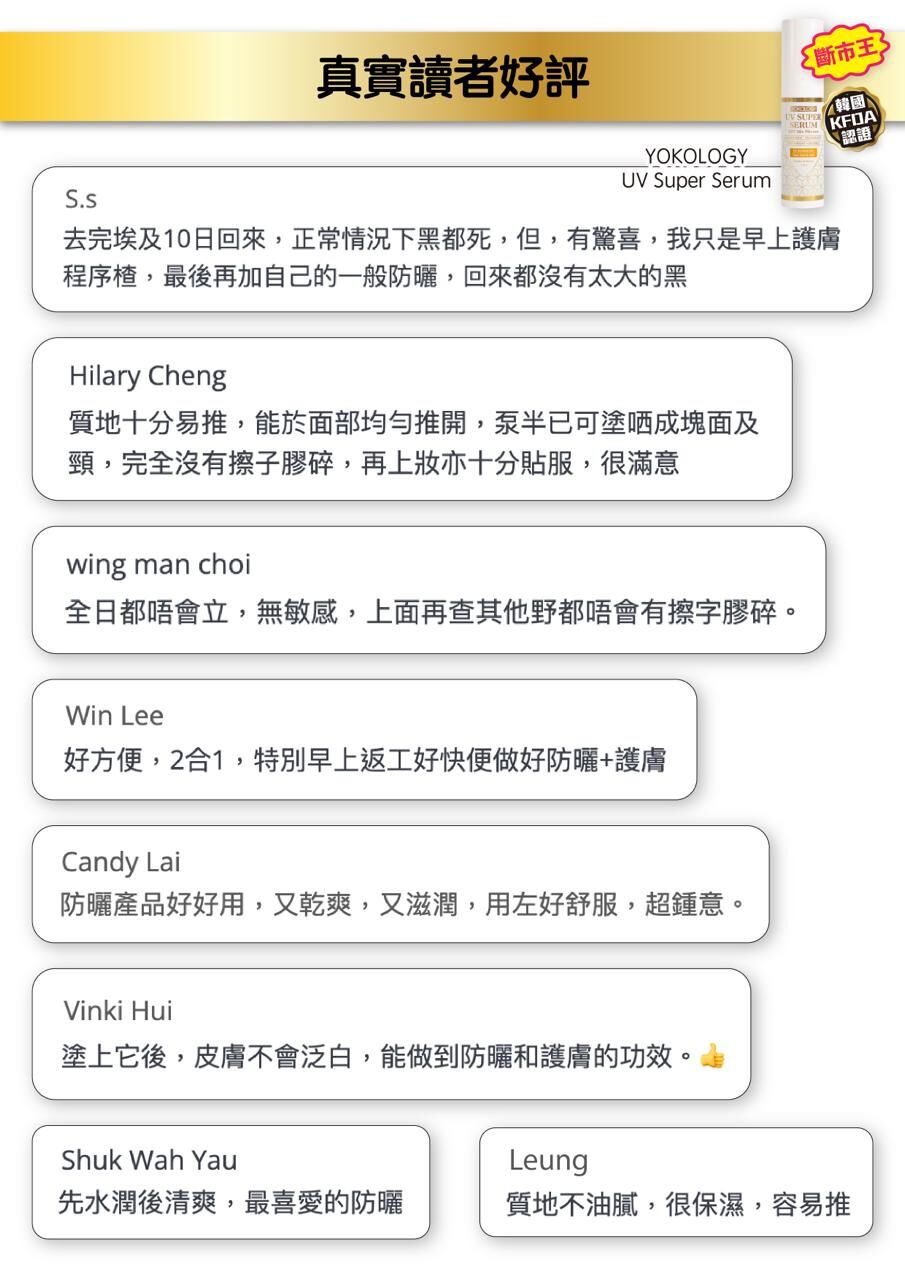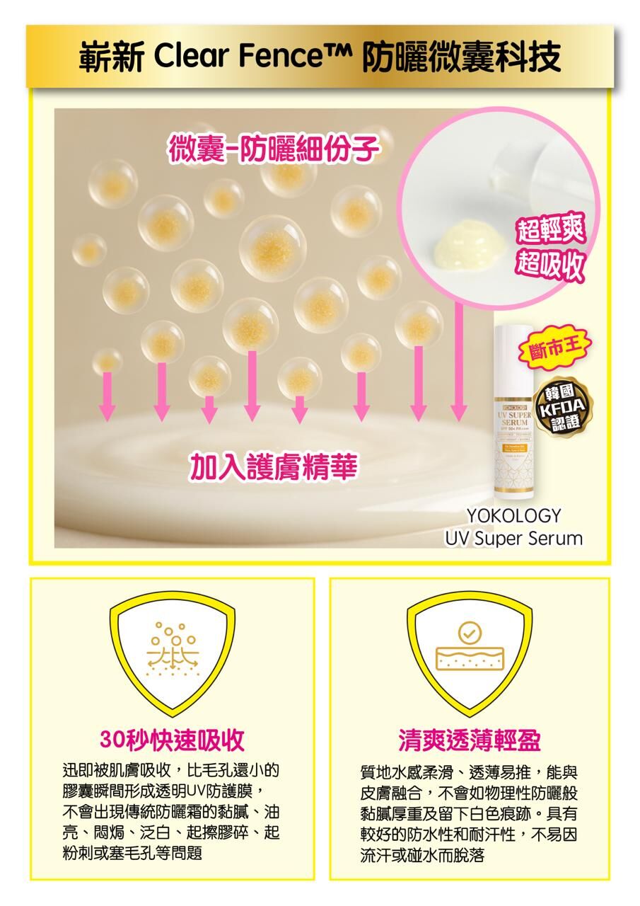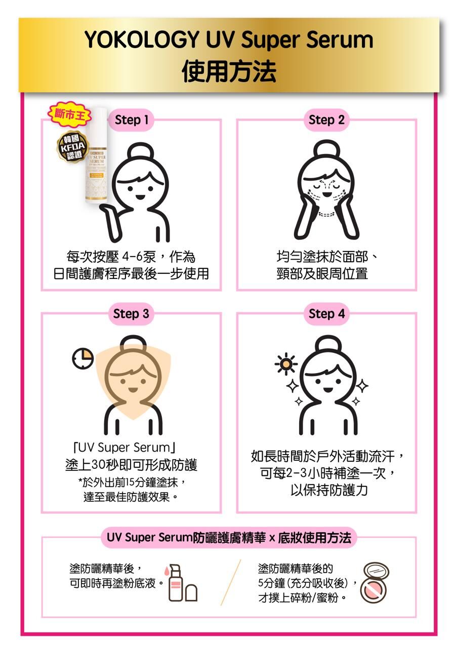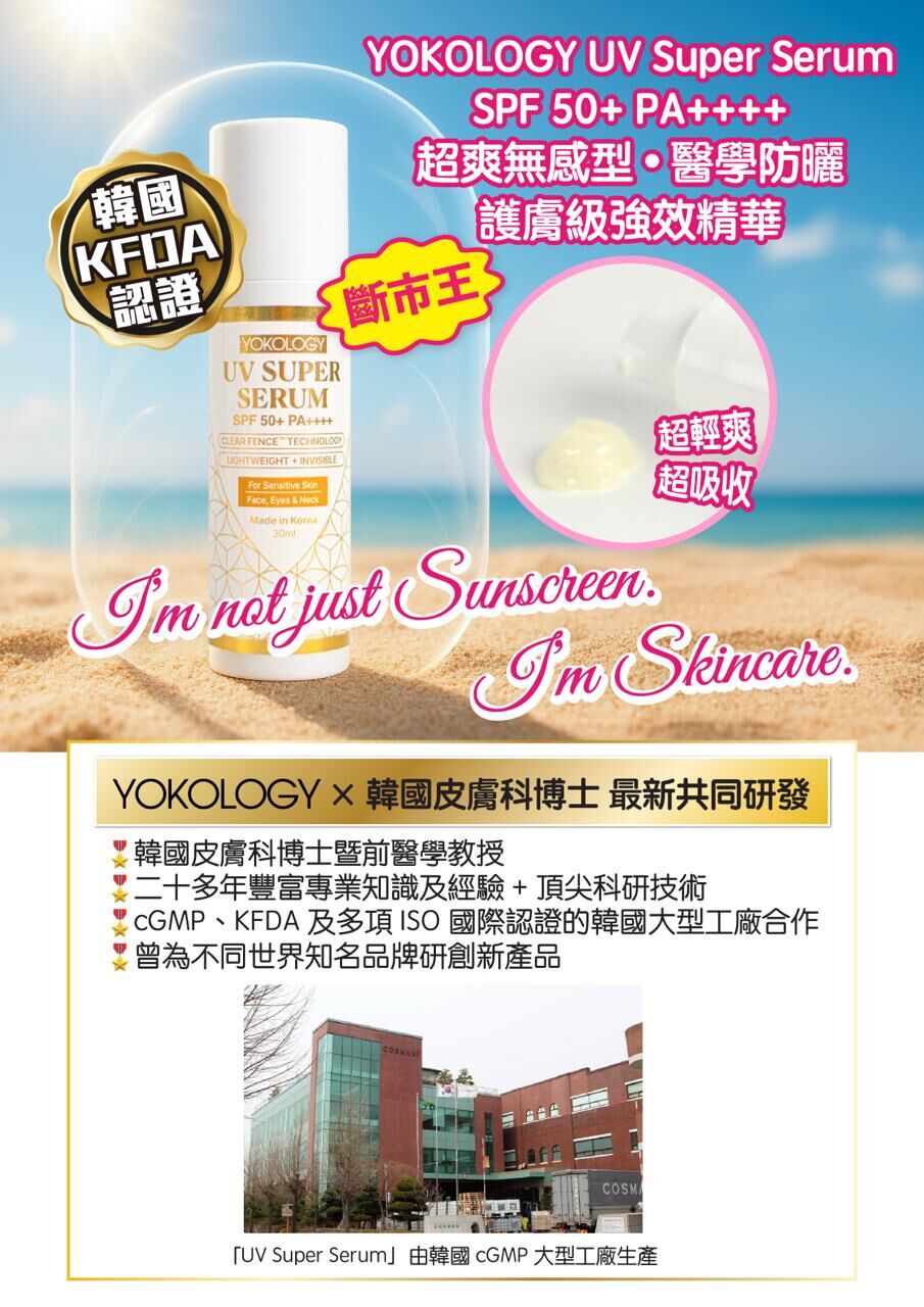 YOKOLOGY UV Super Serum SPF 50+ PA++++「超爽無感型•醫學防曬護膚級強效精華」扭轉傳統防曬定義,與韓國科研團隊及皮膚科博士共同研發,結合先進科研技術,集高效防曬防斑防老化,與全效修護亮白肌膚於一身。此防曬為肌膚做好屏障,一年四季都要用!