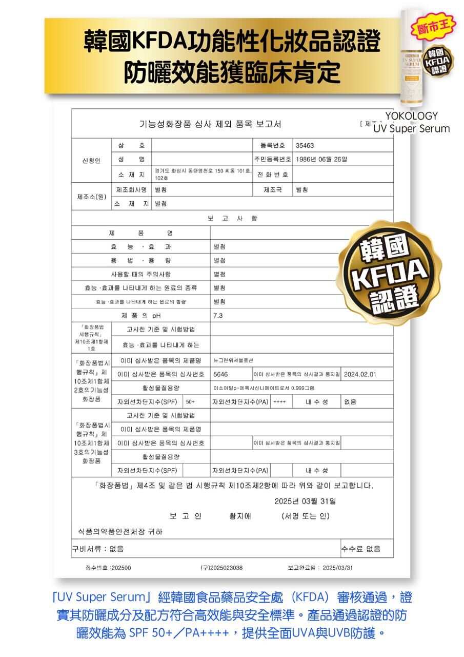 「UV Super Serum」經韓國食品藥品安全處(KFDA)審核通過,證實其防曬成分及配方符合高效能與安全標準。產品通過認證的防曬效能為 SPF 50+/PA++++,提供全面UVA與UVB防護。