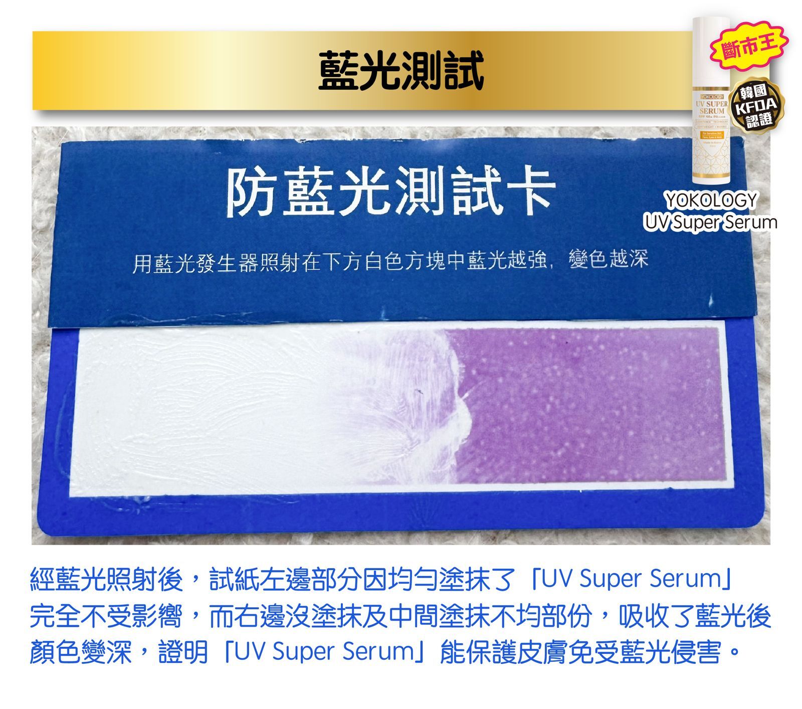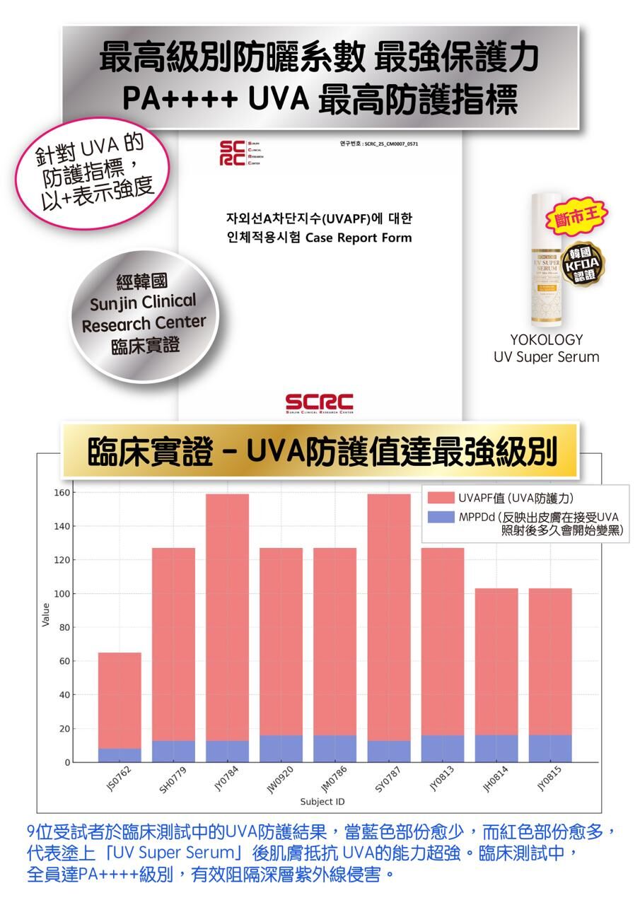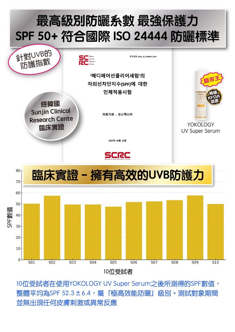 ‧經韓國皮膚科臨床實測,「UV Super Serum」的SPF值高達 52.3 ± 6.4,屬「極高效能防曬」級別。