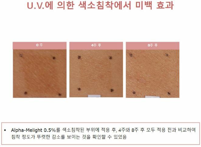 將Bisabolol™專利成份塗於色素沉澱肌膚上,4星期後黑色素明顯減淡,8星期後膚色變得更白淨均勻。