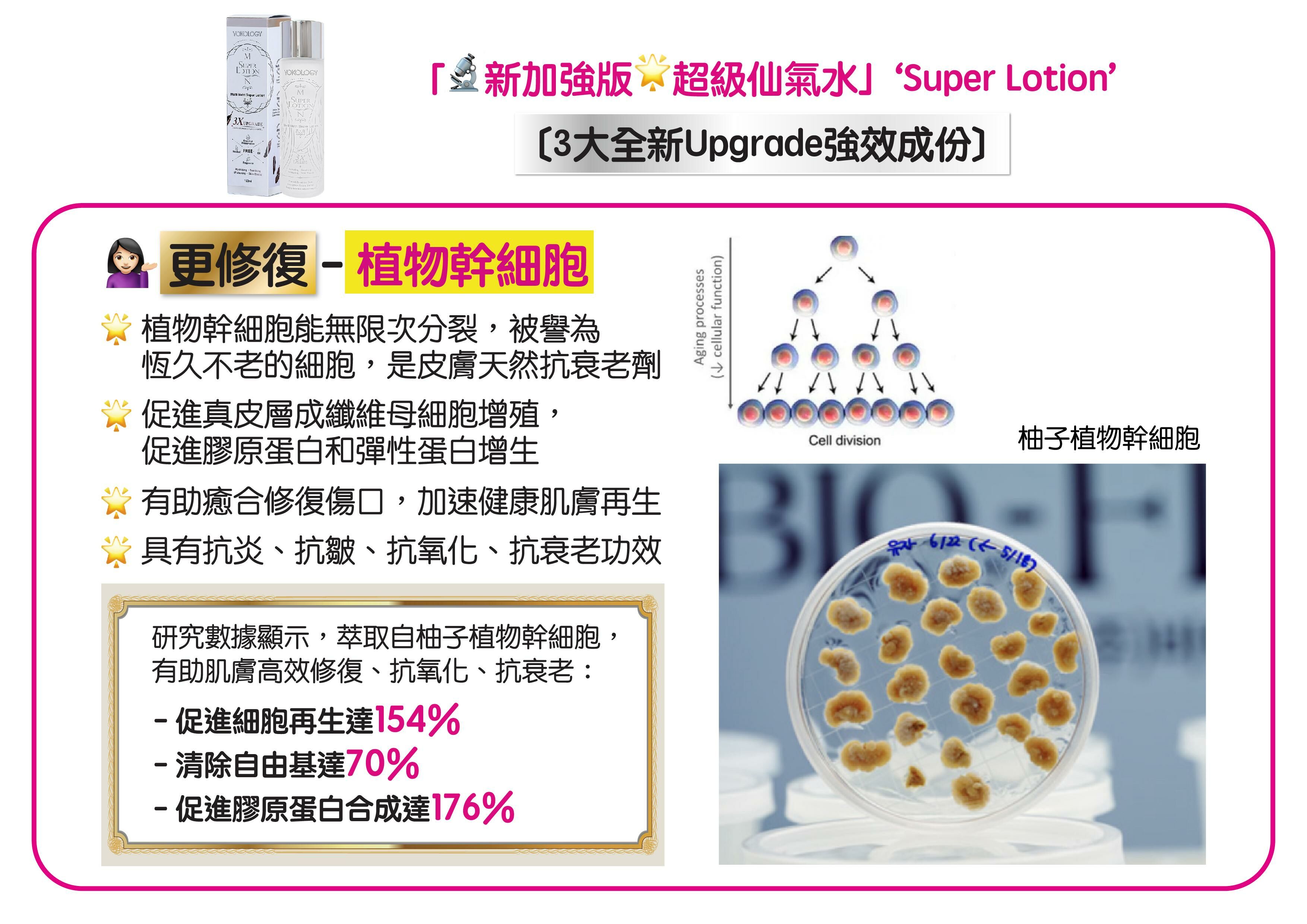 3大全新Upgrade強勁成份 = 超級紓敏「積雪草」x 超強保濕「神經醯胺」x 超高效修復「植物幹細胞」,配合原有王牌韓國大廠專利甲殼素、KFDA認證美白成份、水解膠原蛋白肽及多種亮點修護元素,完美調配黃金比例,加上韓國嶄新注滲技術,成就全新3X Upgrade版「超級仙氣水」登場。