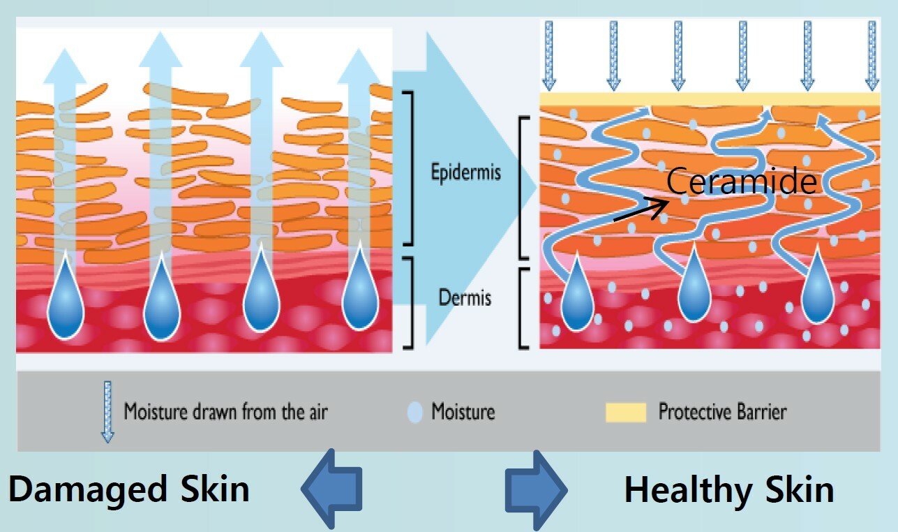 問題肌膚(左)較健康肌膚(右)缺少神經醯胺,皮脂膜/角質層受損,肌膚屏障失衡,水份容易流失。