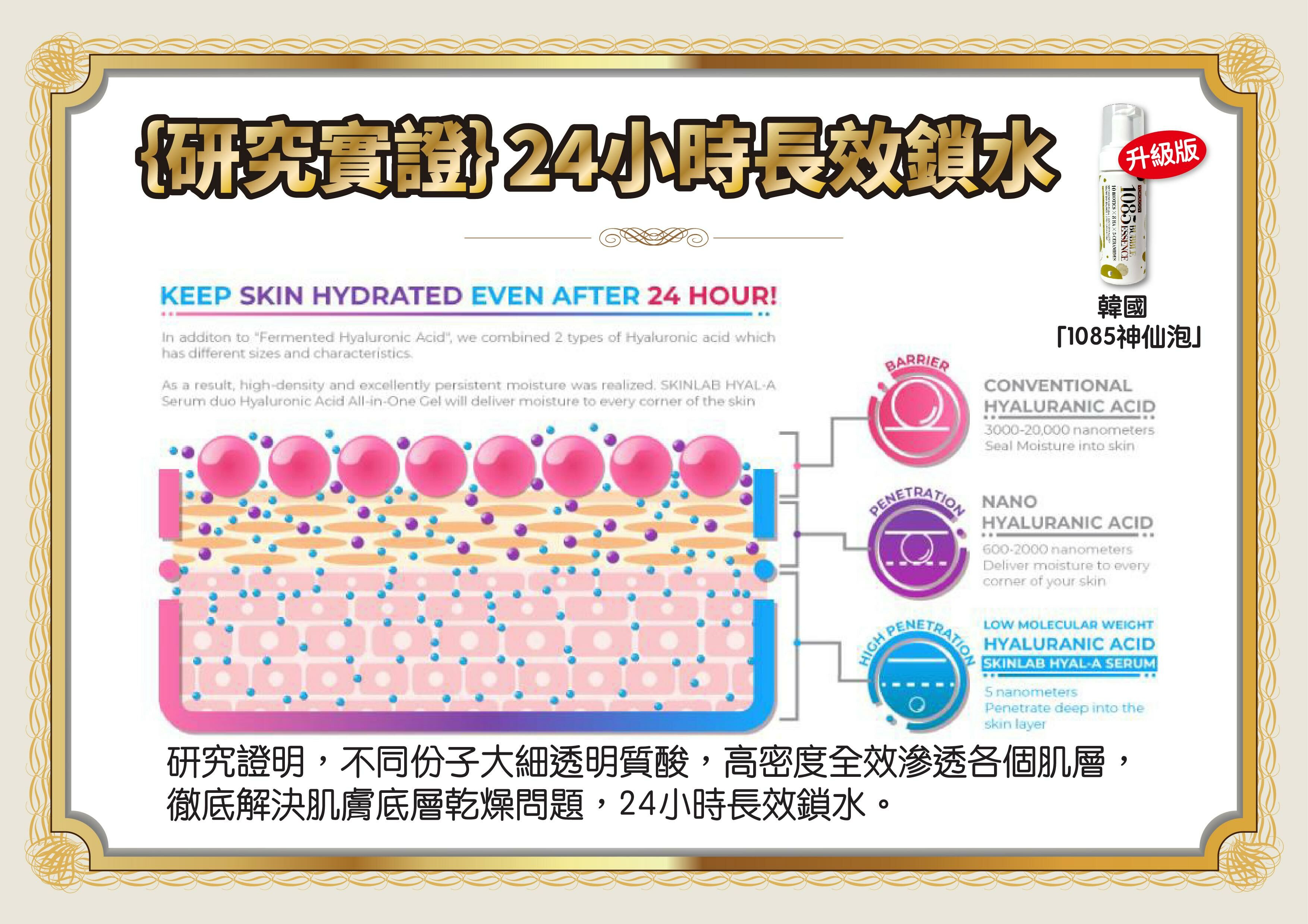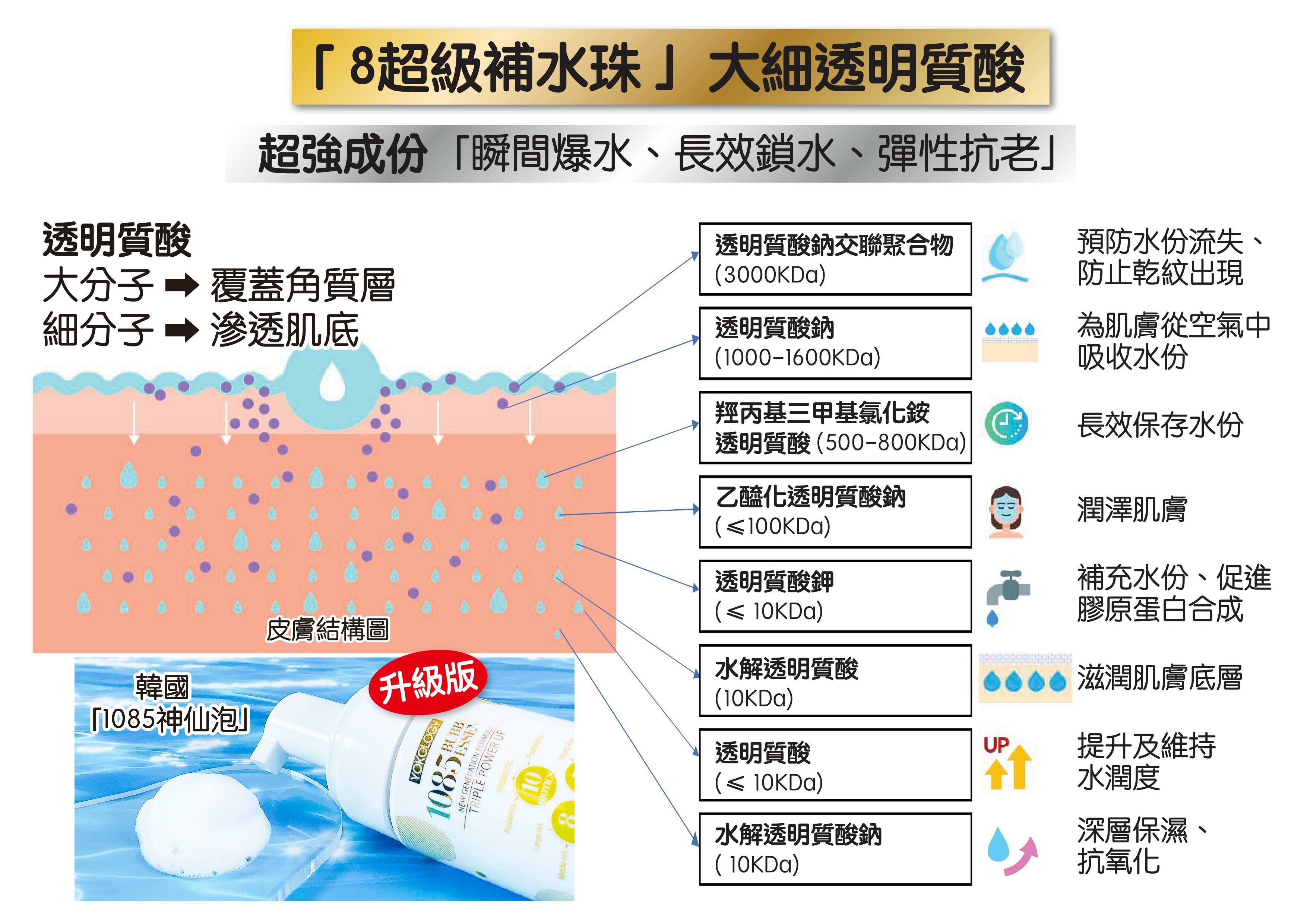 ‧「1085神仙泡」嚴選8款大細份子透明質酸,全面發揮「瞬間爆水、長效鎖水」超卓保濕抗老效能。