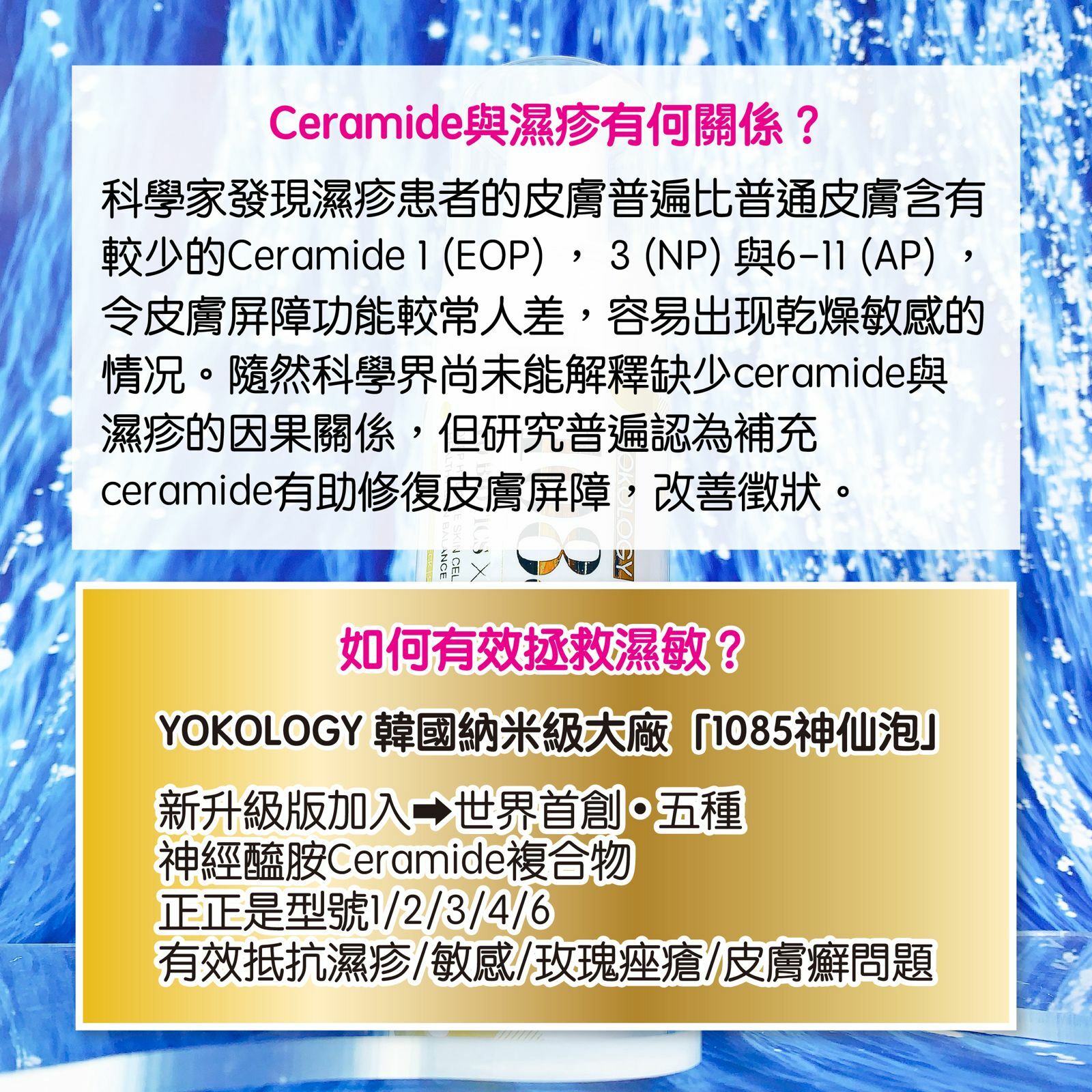 ‧革新升級版「1085神仙泡」突破性加入世一科研首創的「神經醯胺複合物」,根據專業醫學級別建議,結合5大重要類型神經醯胺:Ceramide 1 (EOP)、Ceramide 2 (NS)、Ceramide 3 (NP)、Ceramide 4(AS)、Ceramide 6 (AP) 。