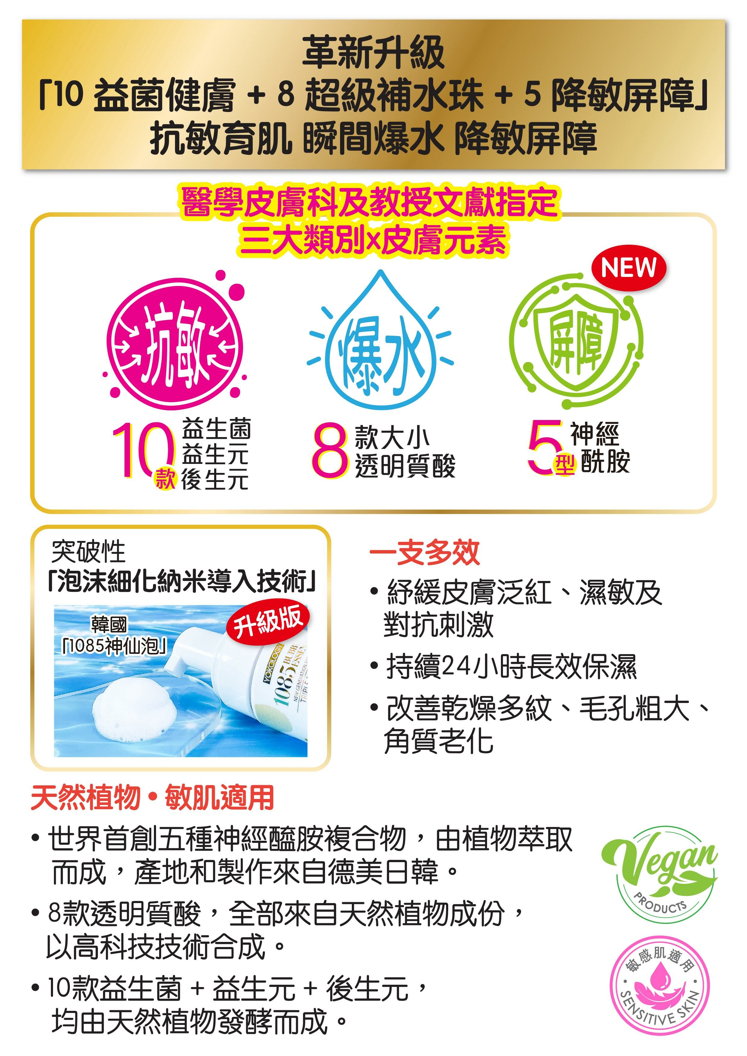 「108神仙泡」贏盡口碑,2025’新升級「1085神仙泡」保證成效更強,定必成為王者之王!結合醫學皮膚科及教授文獻指定~3大類別健膚要素,益生菌/益生元+透明質酸+神經醯胺,「1085」更匯聚以上成份多達23種。