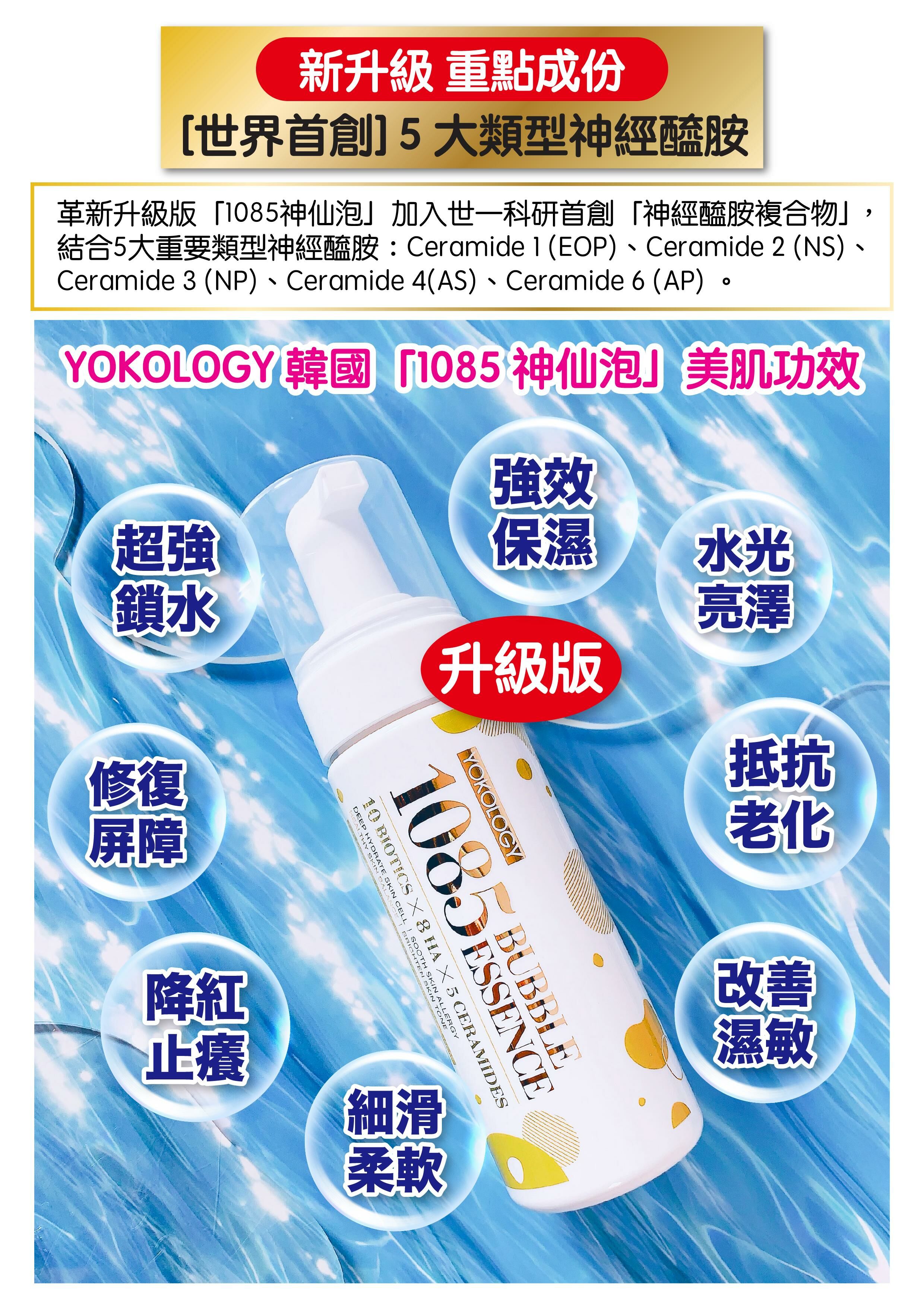 「神仙泡」自推出後贏盡一致好評,真實用家激讚「保濕度極高」、「好幫到舒敏」、「塊面光澤咗」「皮膚超柔軟好吸收」……今年精益求精,革新升級版特別加入‘World First’世一首創、科研成果「神經醯胺複合物」,由5大重要類型神經醯胺組成,是健康肌膚建立補水抗敏屏障,原生必要元素;配合原有「10+8」配方,成就「1085神仙泡」泡沫微精華,全方位加強降敏爆水光澤健膚美肌效能。