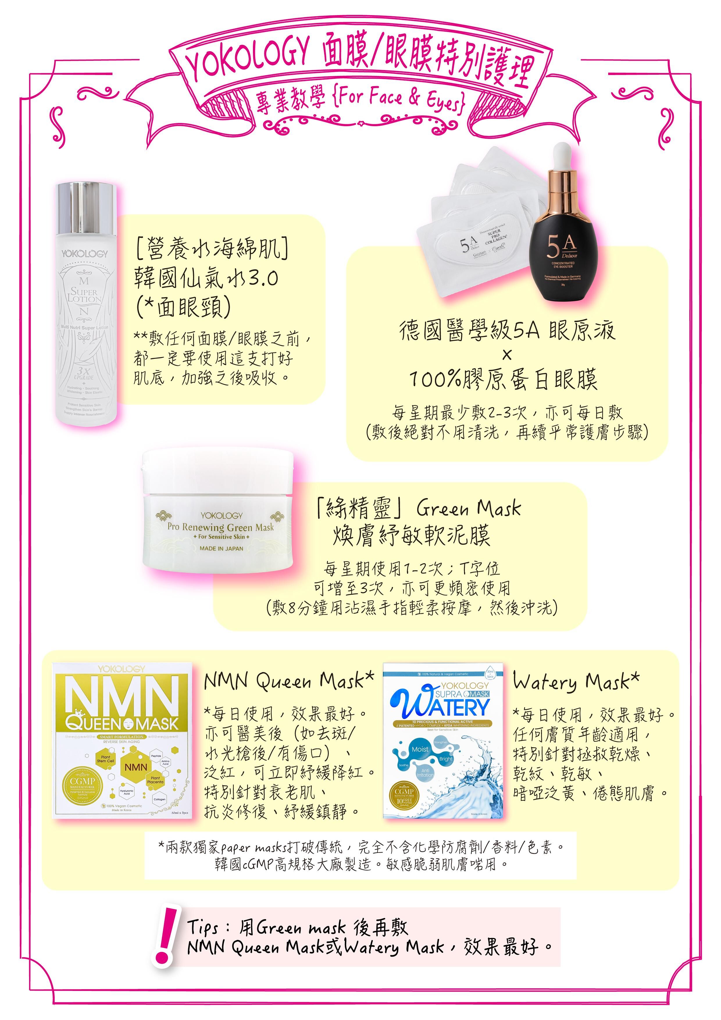 敷上乳霜狀或片裝面膜前,先抹上「超級仙氣水」,令滲透力加強,營養雙得益彰。