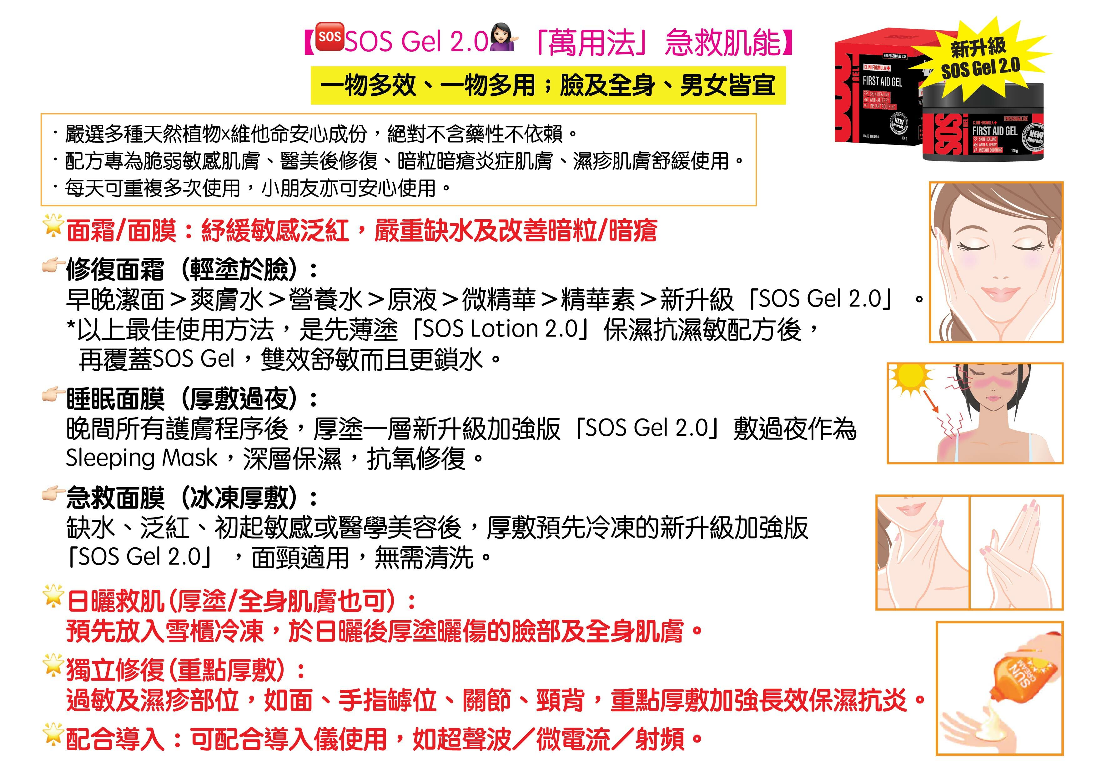 「韓國醫院級‧SOS Gel 2.0」萬用救肌配方絕不含任何化學傷害肌膚成份 ── 如化學性防腐劑、人工香料/色素、酒精、礦物油和矽等,所有皮膚類型適用,包括濕疹類皮膚。