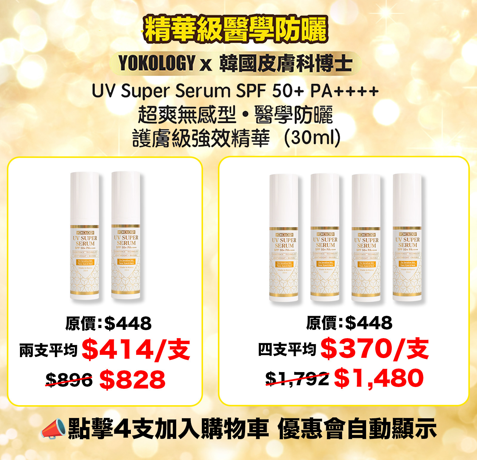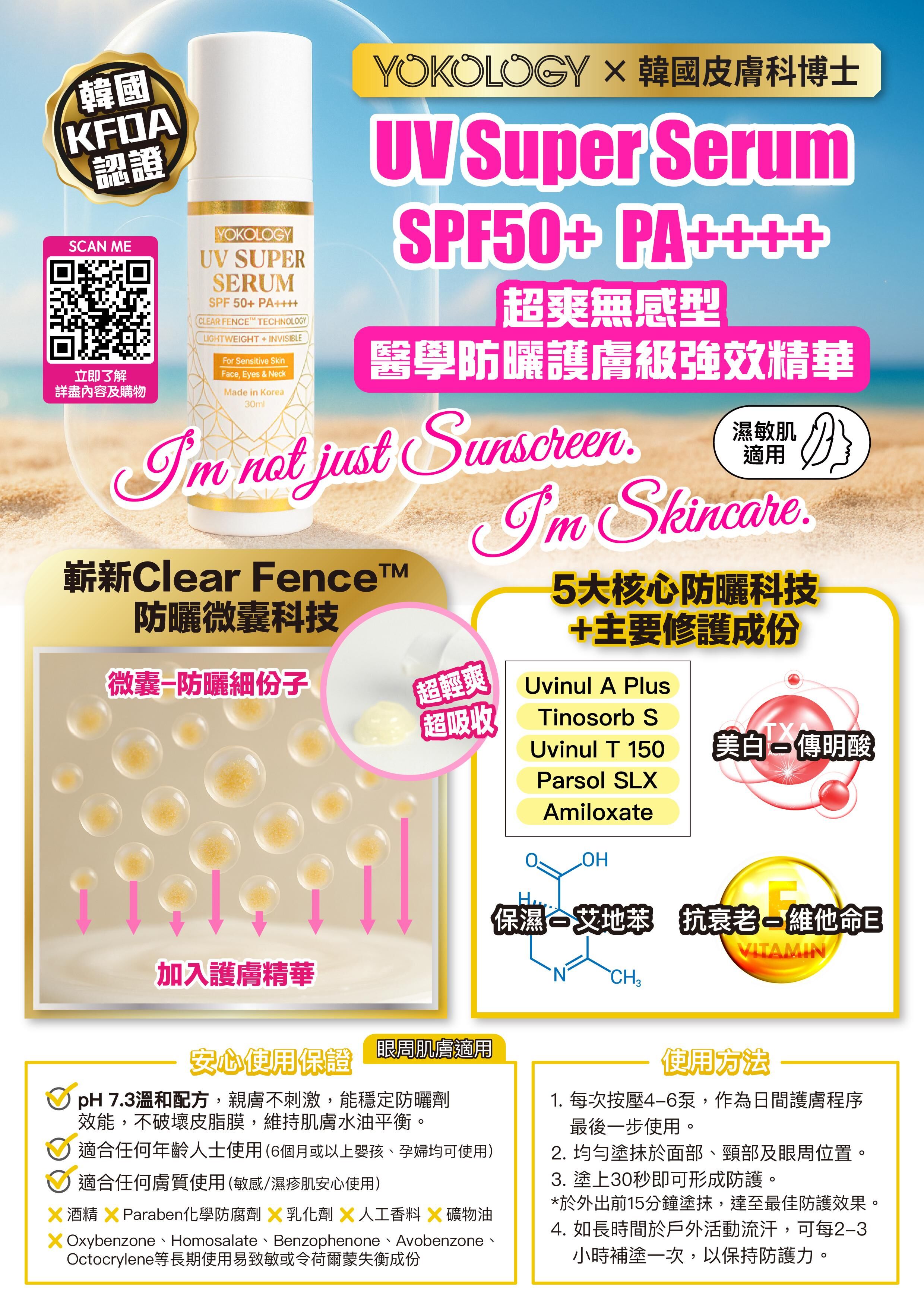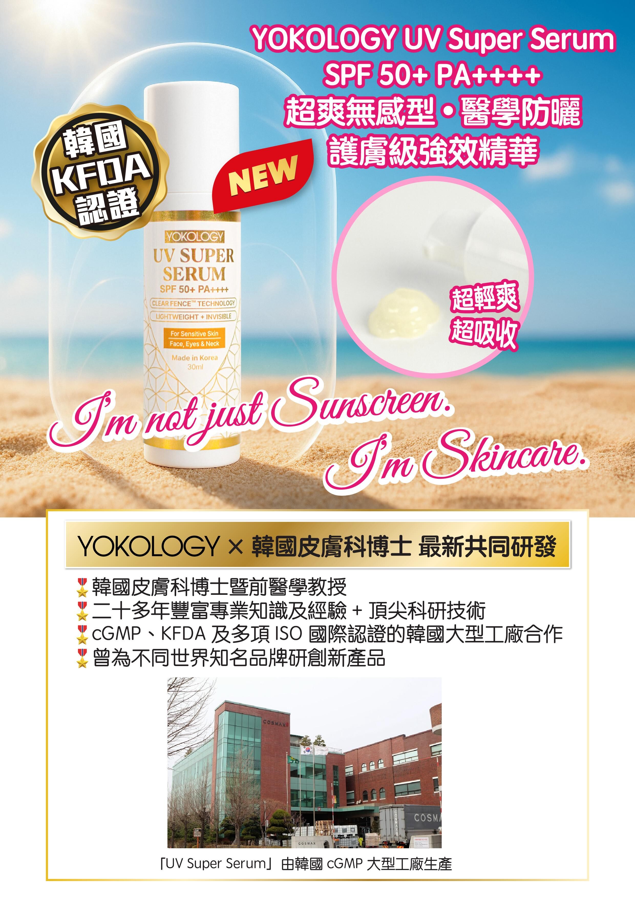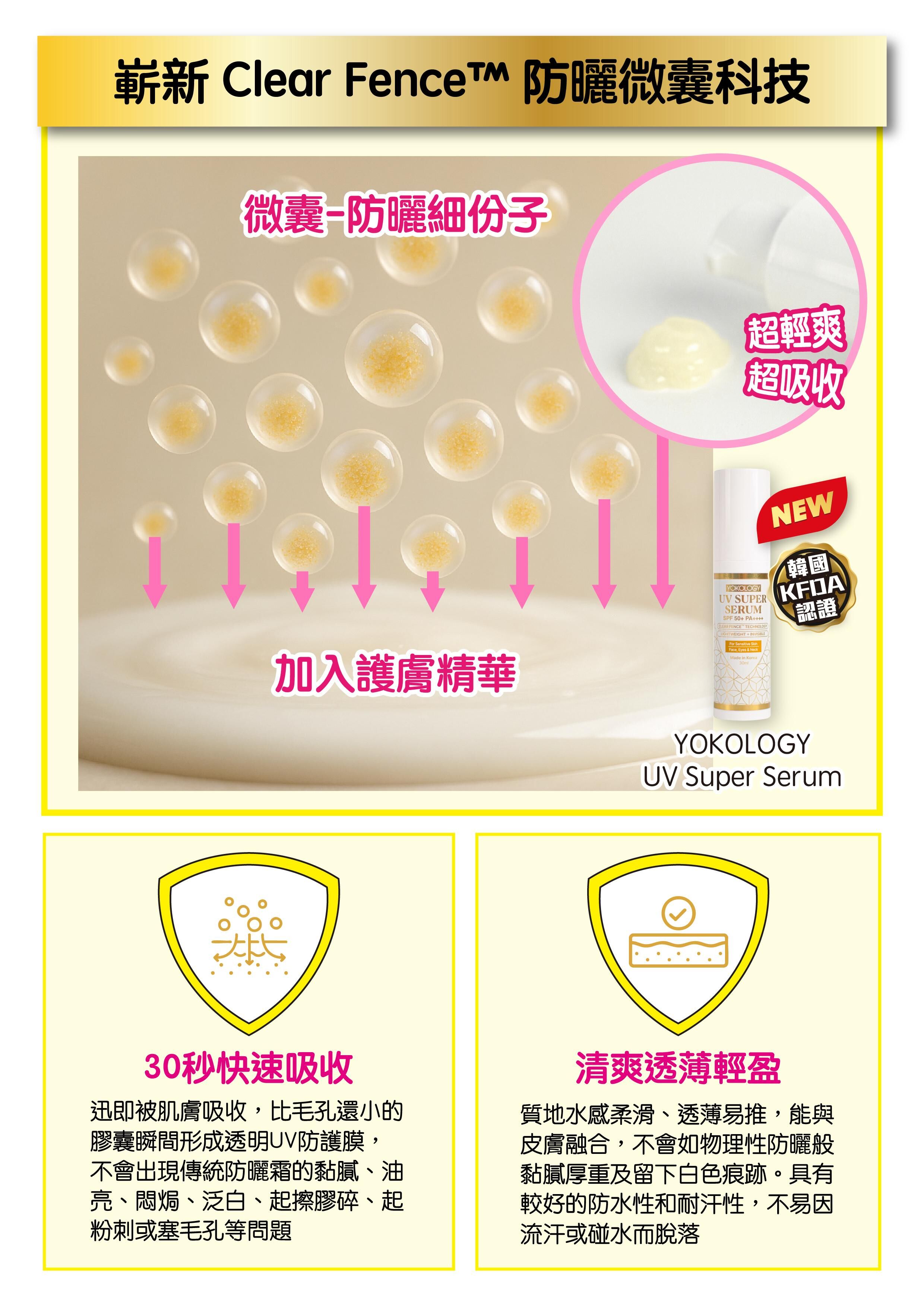YOKOLOGY UV Super Serum SPF 50+ PA++++「超爽無感型•醫學防曬護膚級強效精華」扭轉傳統防曬定義,與韓國科研團隊及皮膚科博士共同研發,結合先進科研技術,集高效防曬防斑防老化,與全效修護亮白肌膚於一身。此防曬為肌膚做好屏障,一年四季都要用!