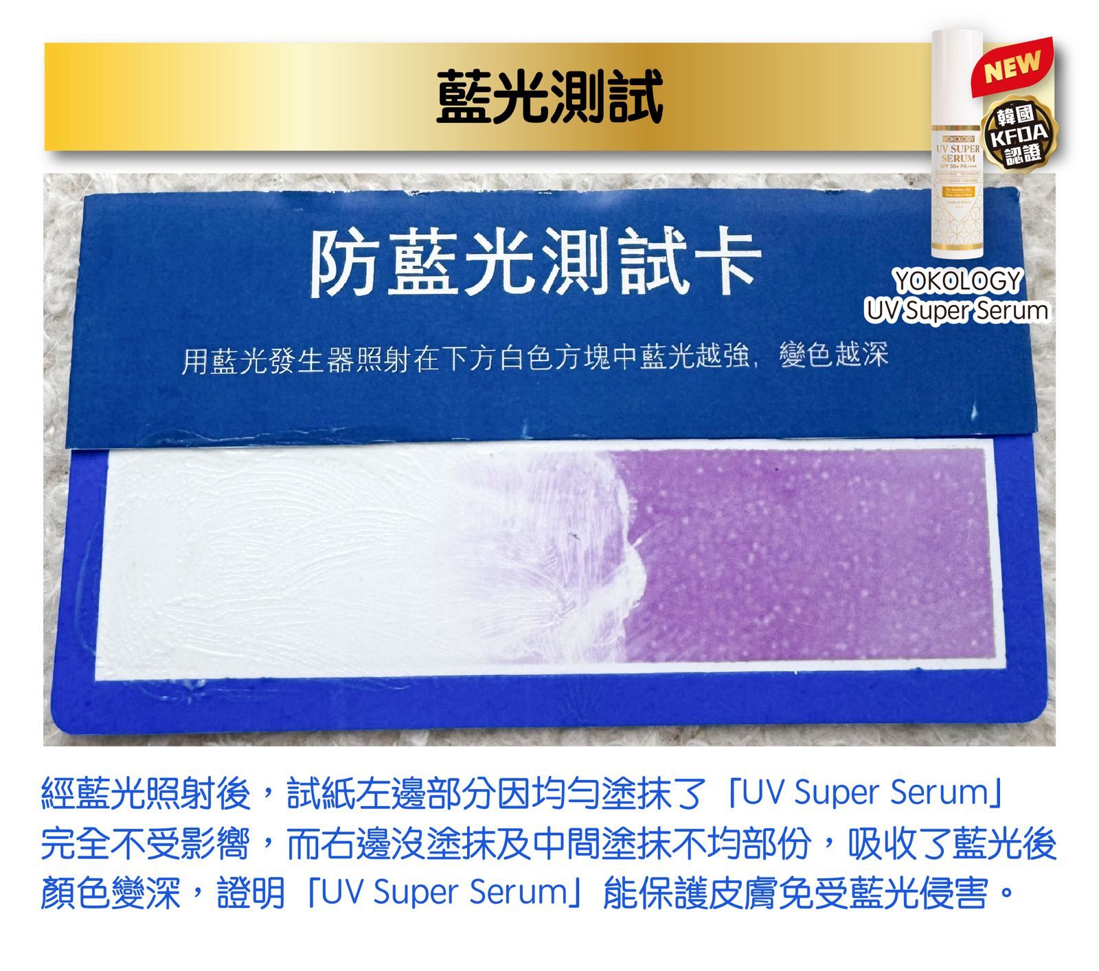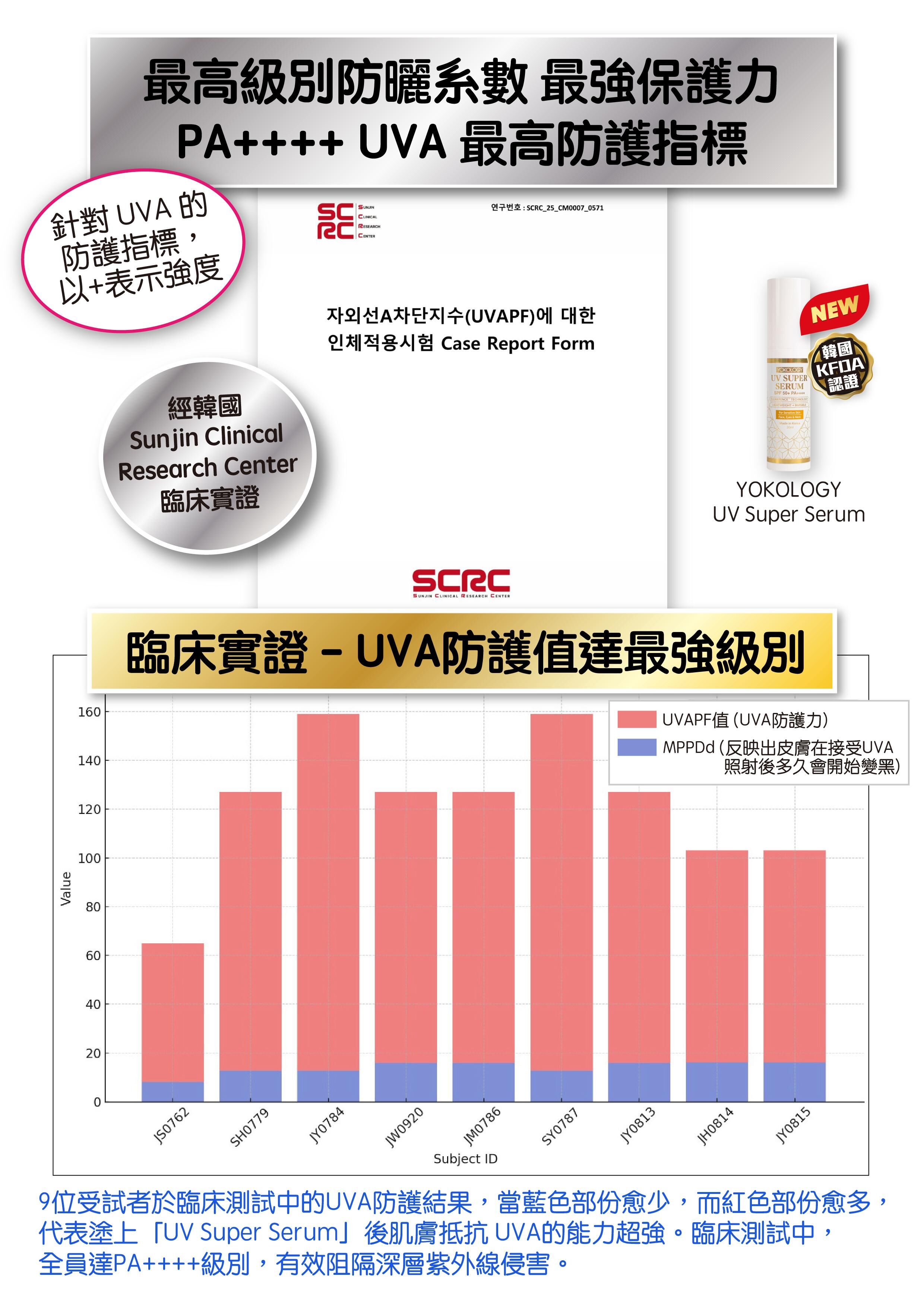 ‧經韓國皮膚科臨床實測,「UV Super Serum」的SPF值高達 52.3 ± 6.4,屬「極高效能防曬」級別。
