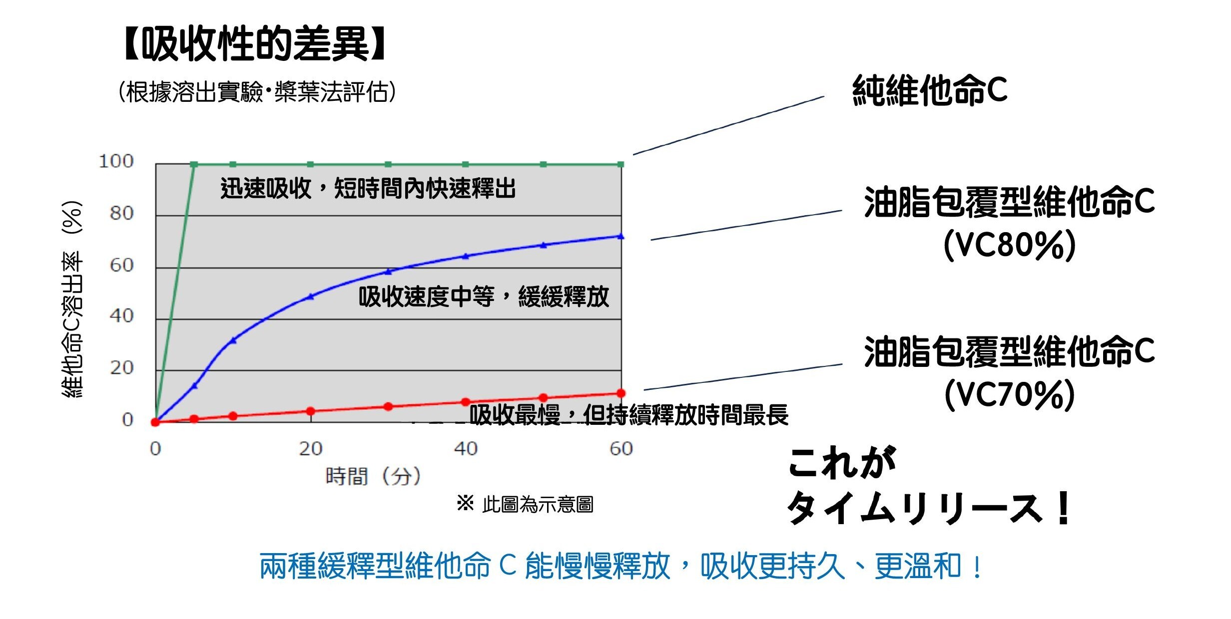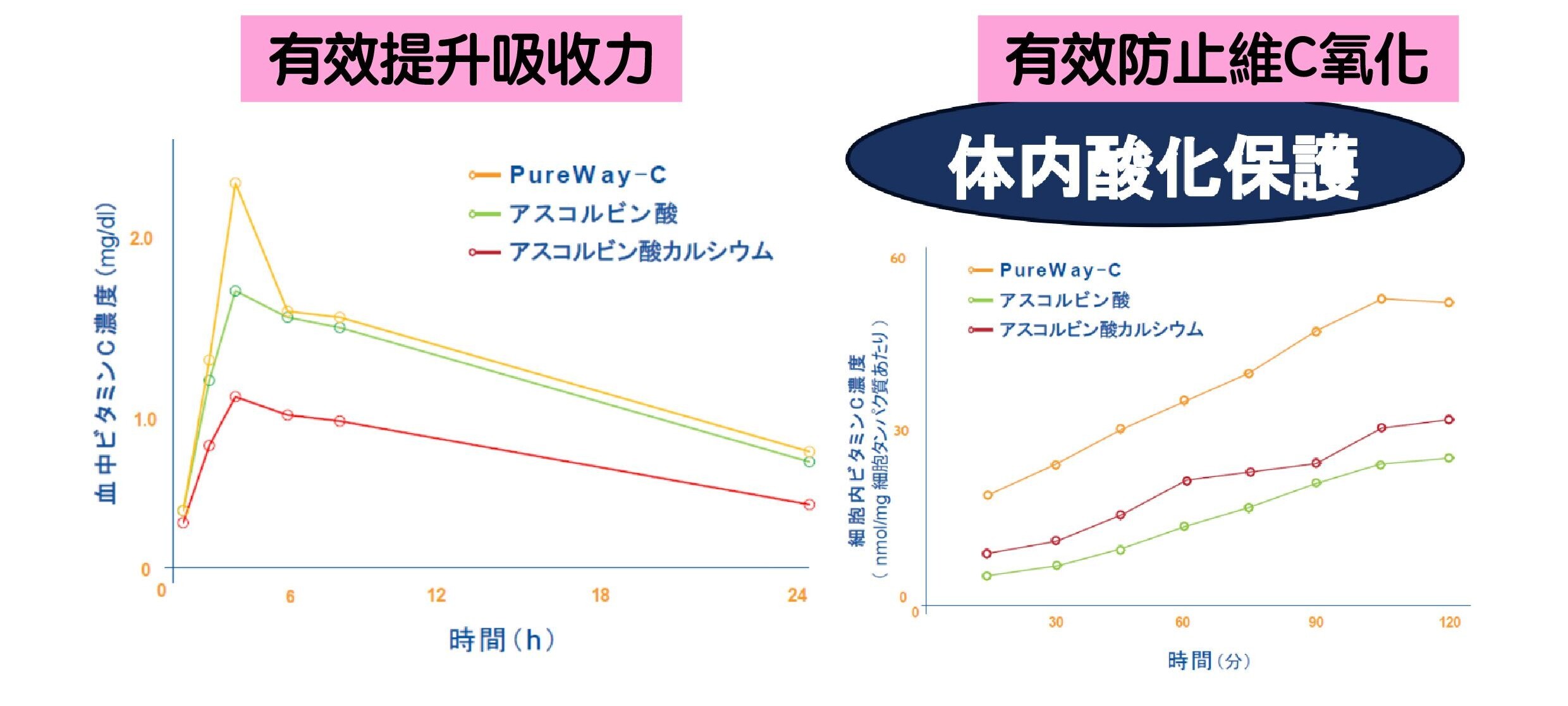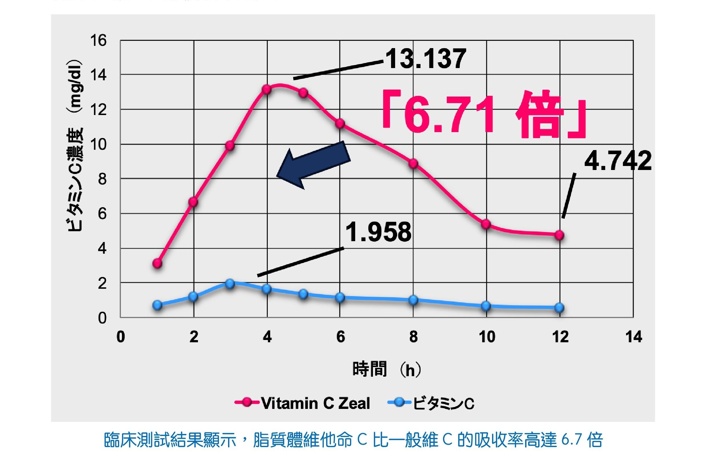 左:相比其他維C能更快速進入血液並維持較高濃度,代表吸收力明顯提升。