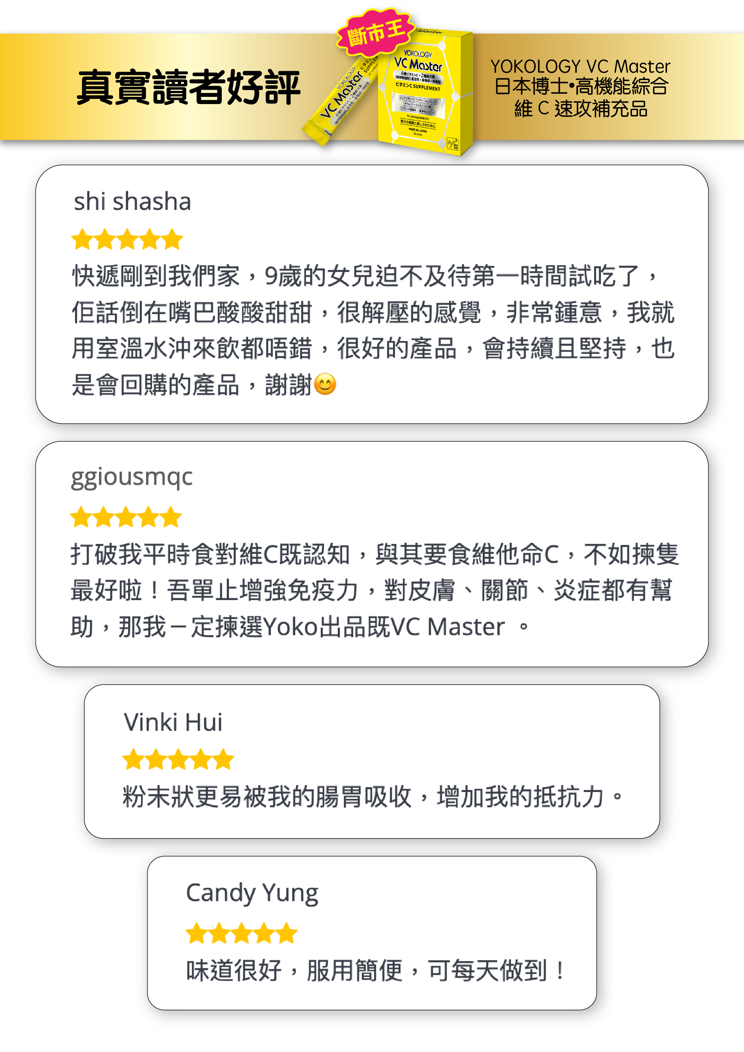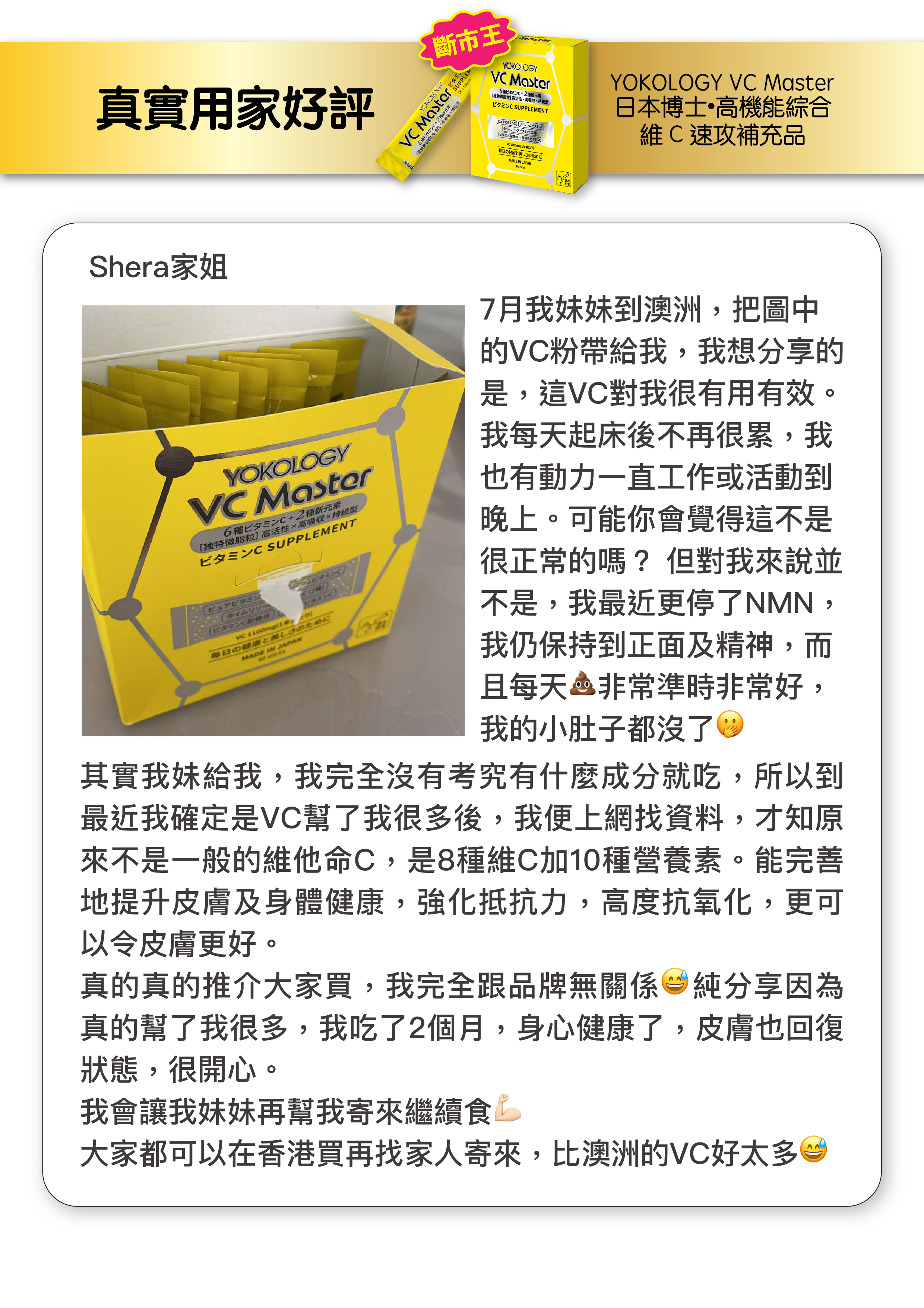 Yoko:「每日食1條,有齊8種維C + 10大營養素;品質Premium,價錢親民,健與美話咁易!」