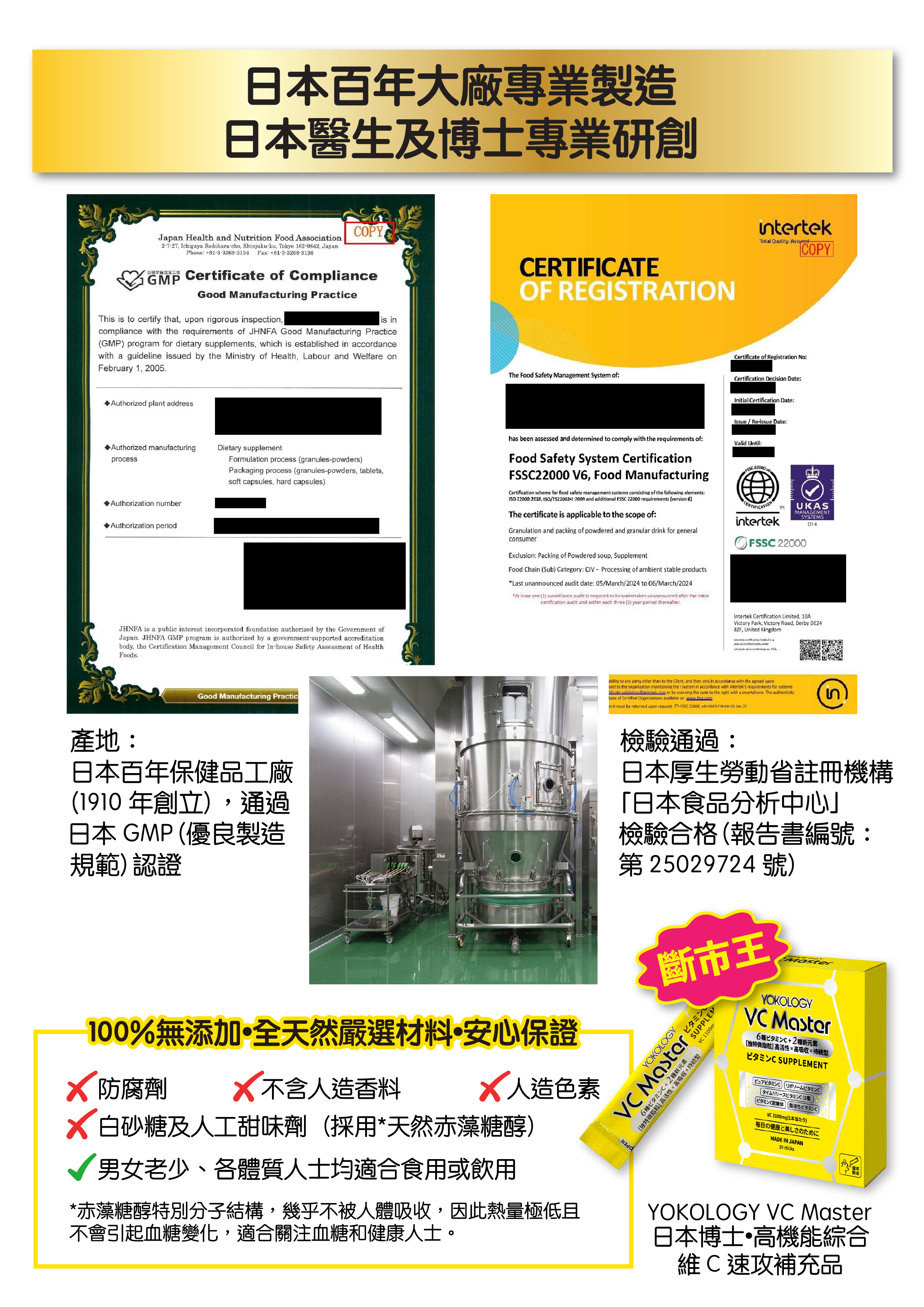 VC Master由日本百年GMP認證補充品/健康食品工廠生產,並通過日本食品分析中心檢驗(報告書編號:第25029724號),品質安全值得信賴。