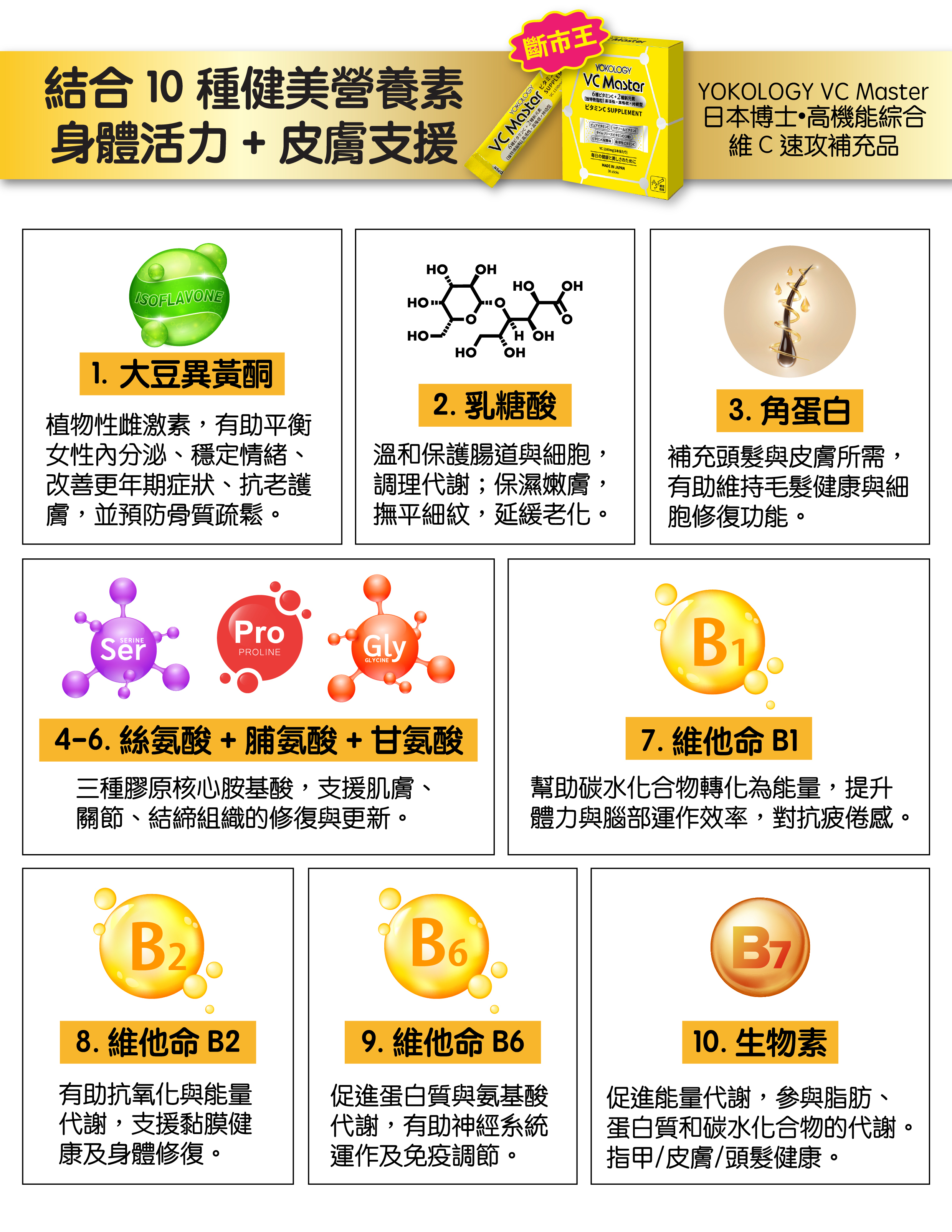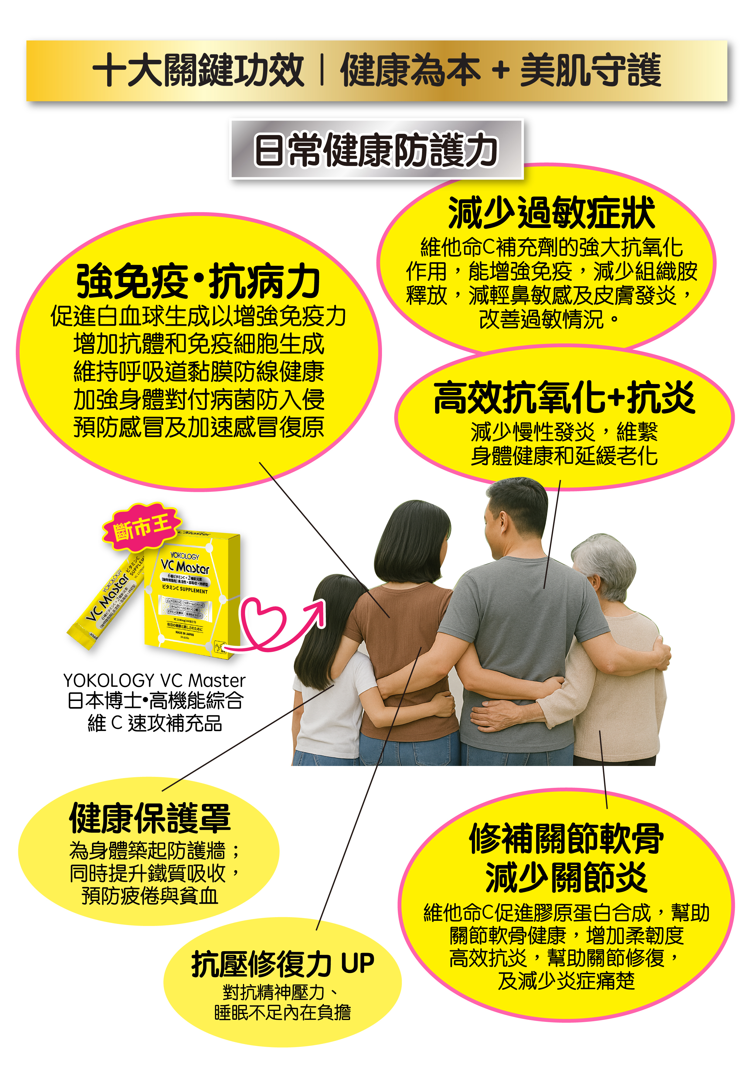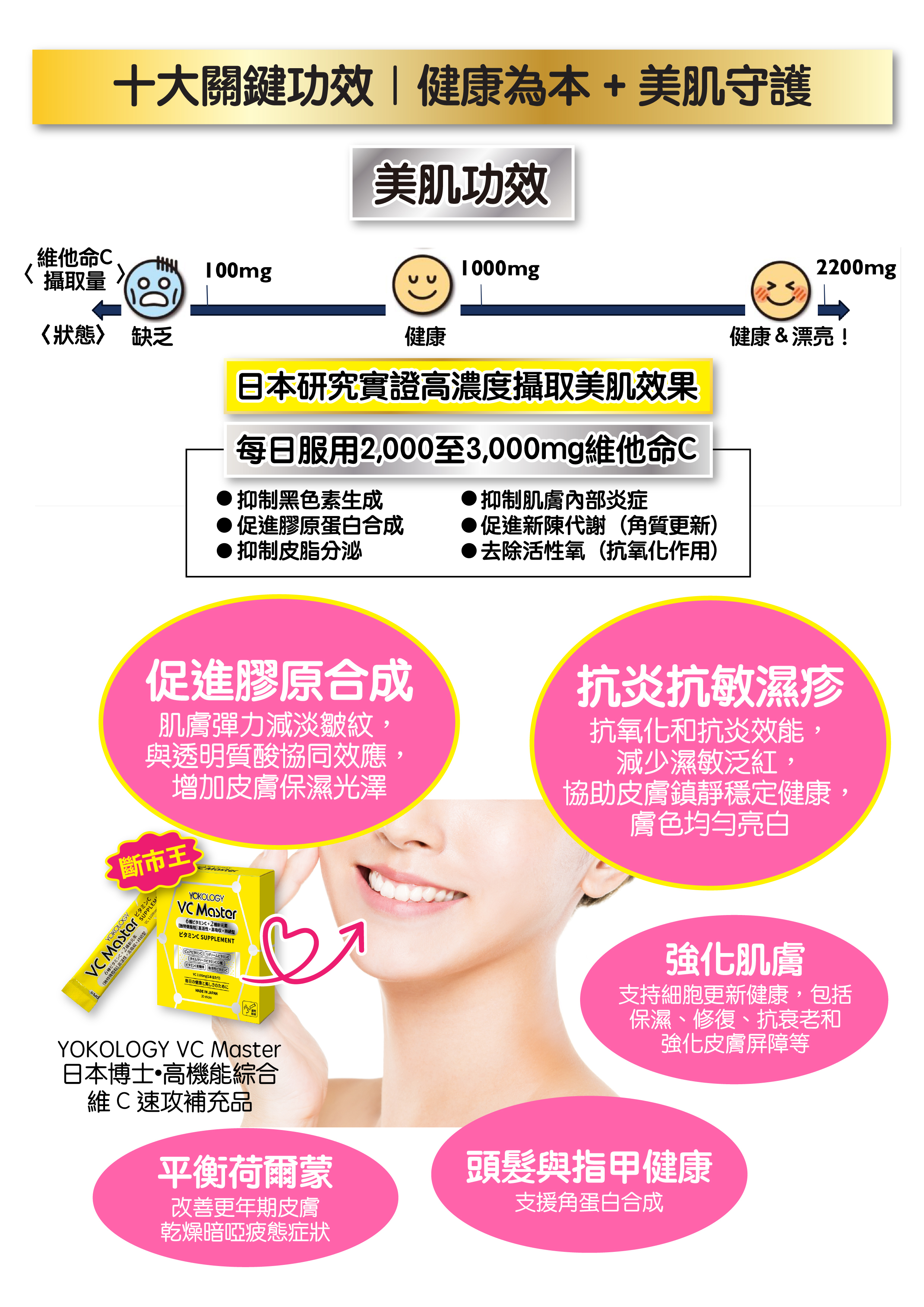 YOKOLOGY VC Master 絕對是新世代維他命C補充品的破格代表作,以專家科學級配方結合 8種高機能維他命C 和10種營養素,全方位顧及,實現「即效抗氧+持續吸收+健康修復+肌膚調理」四大功效,全天候守護健康。