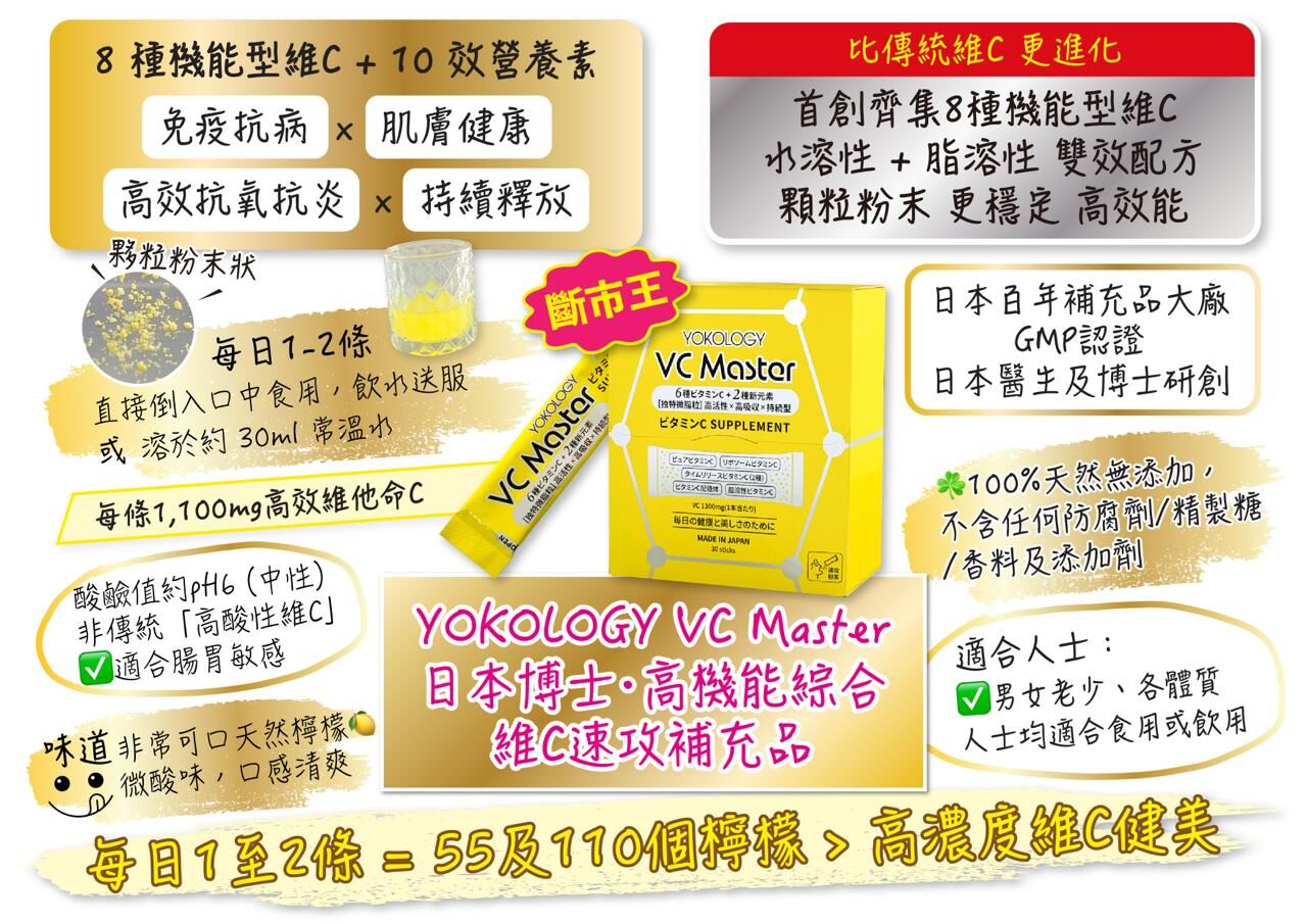 YOKOLOGY VC Master日本博士•高機能維C速攻補充品,由日本百年補充品大廠嚴控製造,專業團隊醫師及藥學博士監修開發。