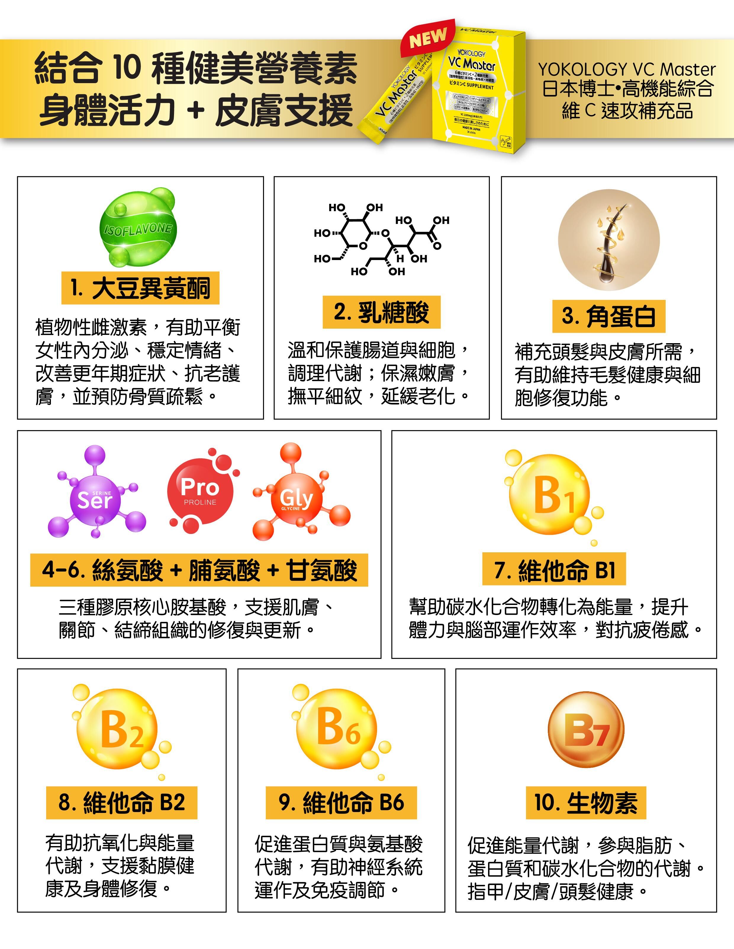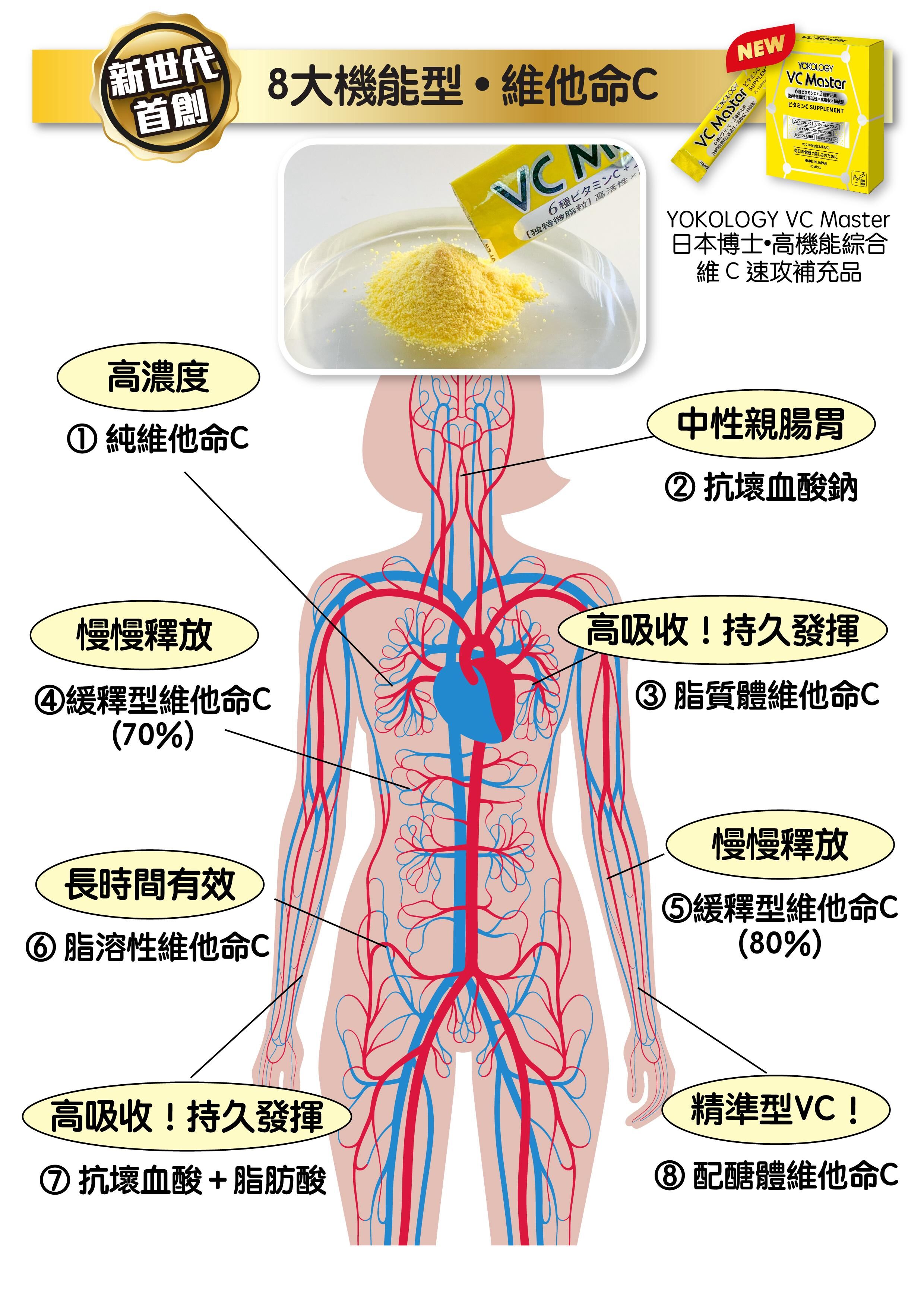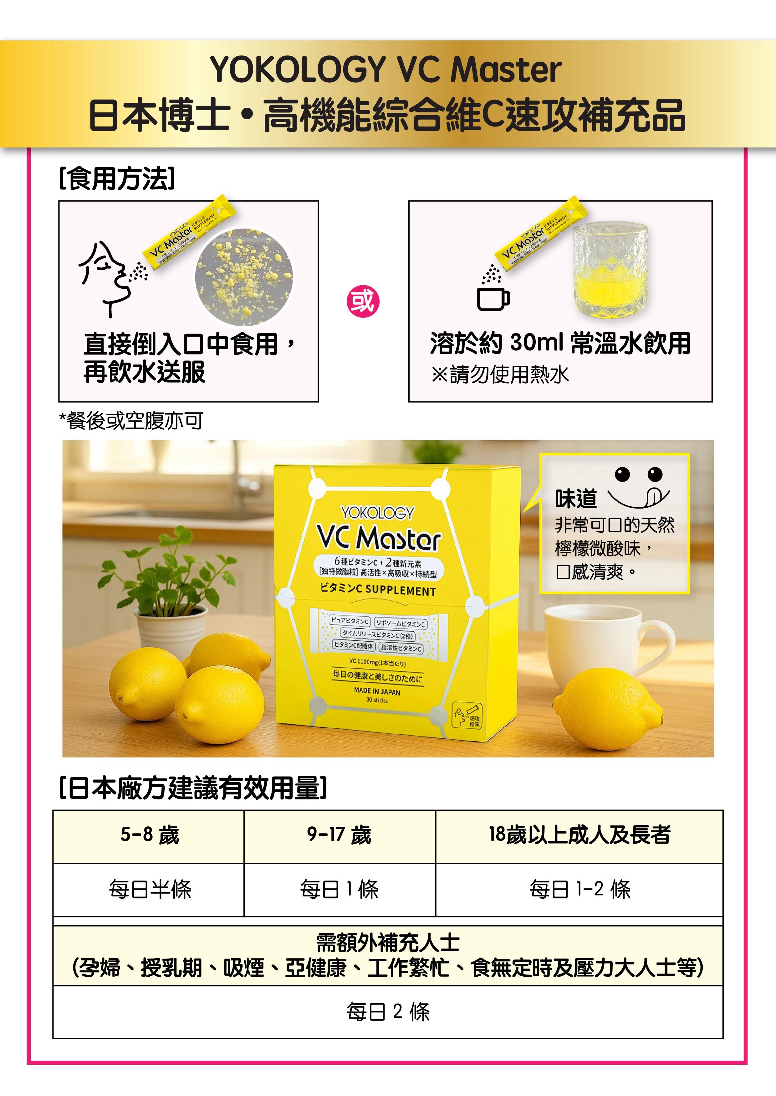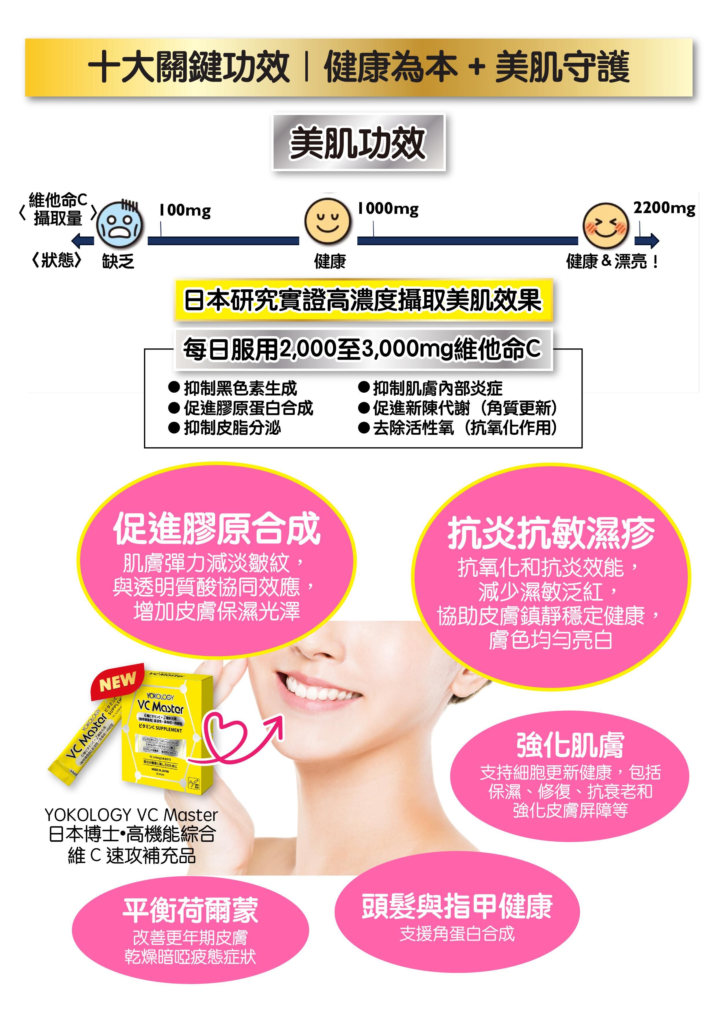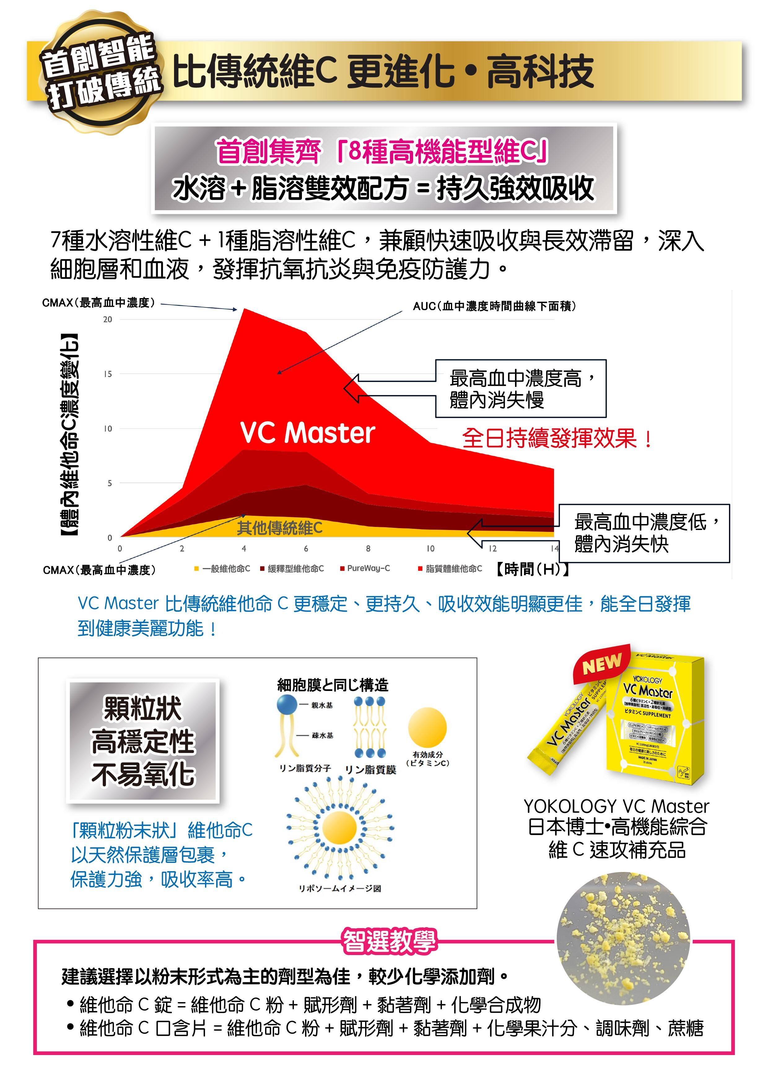 YOKOLOGY VC Master日本博士•高機能維C速攻補充品,由日本百年補充品大廠嚴控製造,專業團隊醫師及藥學博士監修開發。
