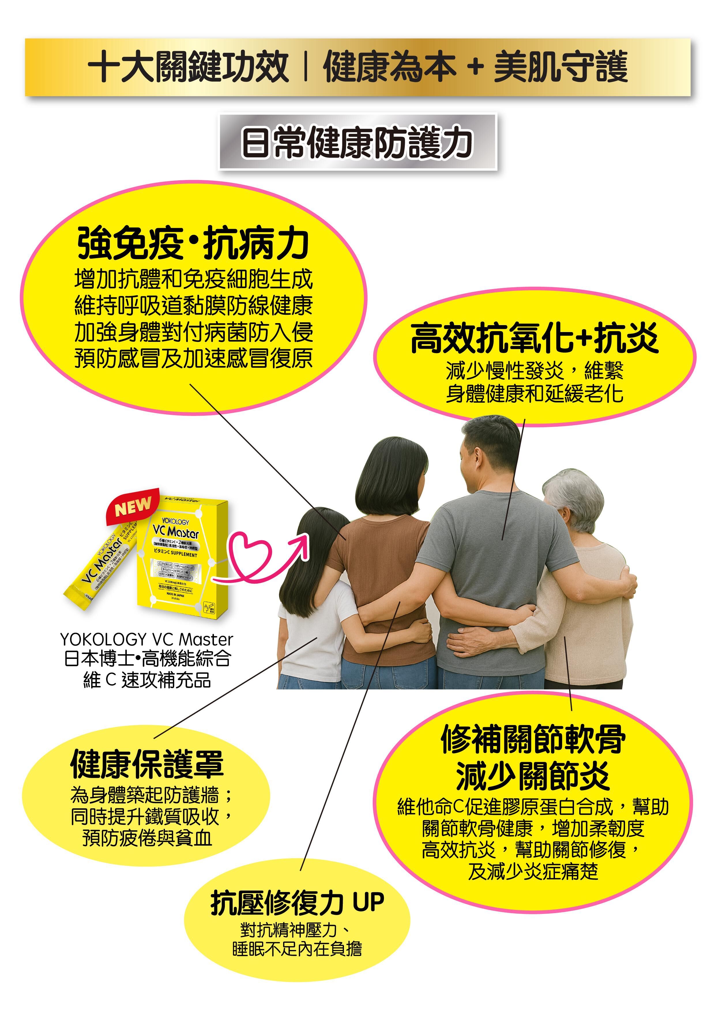 YOKOLOGY VC Master 絕對是新世代維他命C補充品的破格代表作,以專家科學級配方結合 8種高機能維他命C 和10種營養素,全方位顧及,實現「即效抗氧+持續吸收+健康修復+肌膚調理」四大功效,全天候守護健康。