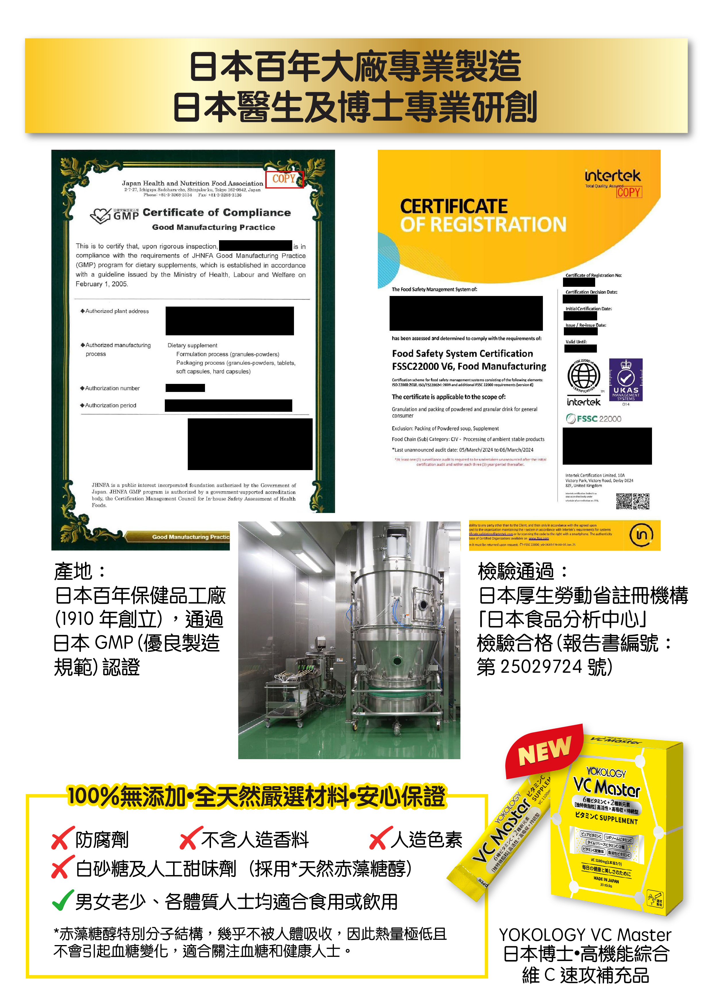 VC Master由日本百年GMP認證補充品/健康食品工廠生產,並通過日本食品分析中心檢驗(報告書編號:第25029724號),品質安全值得信賴。