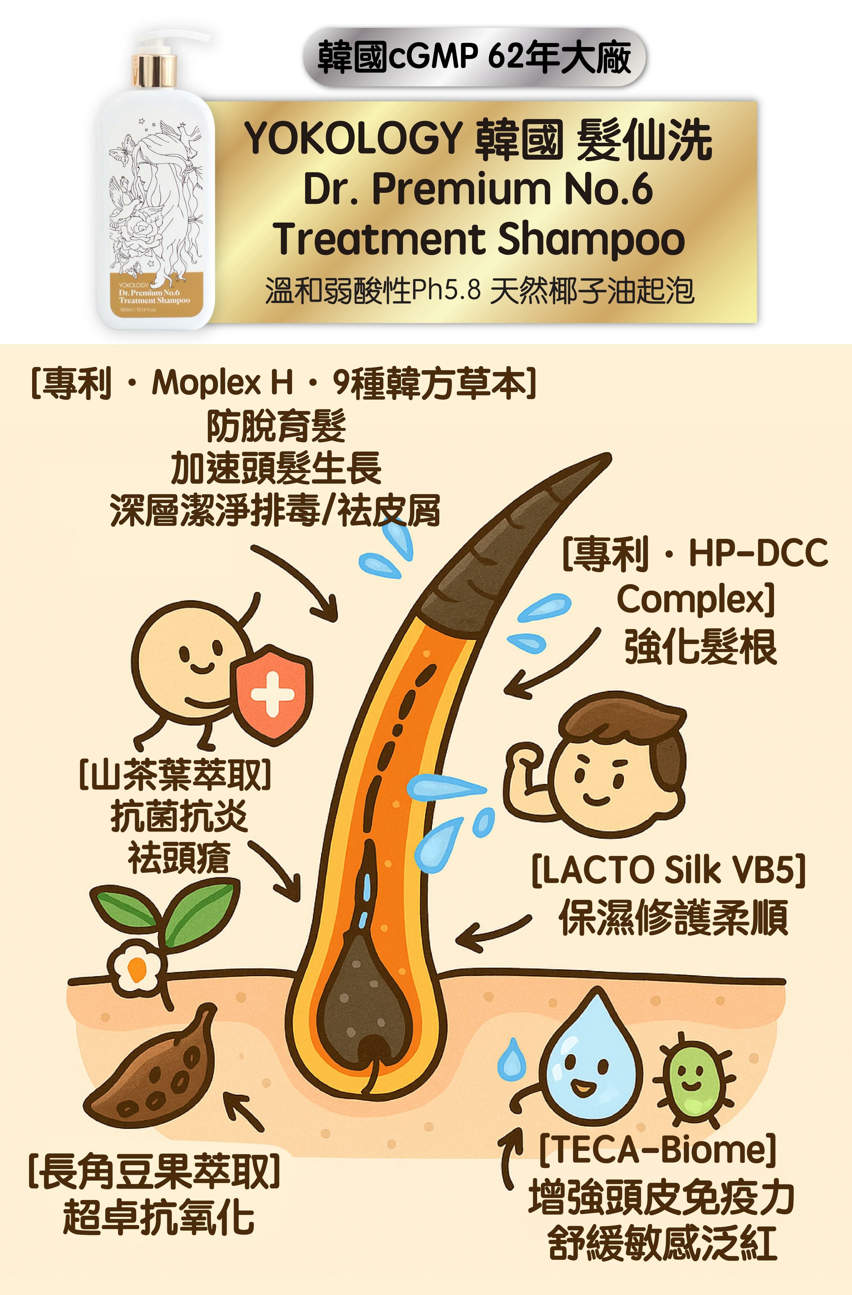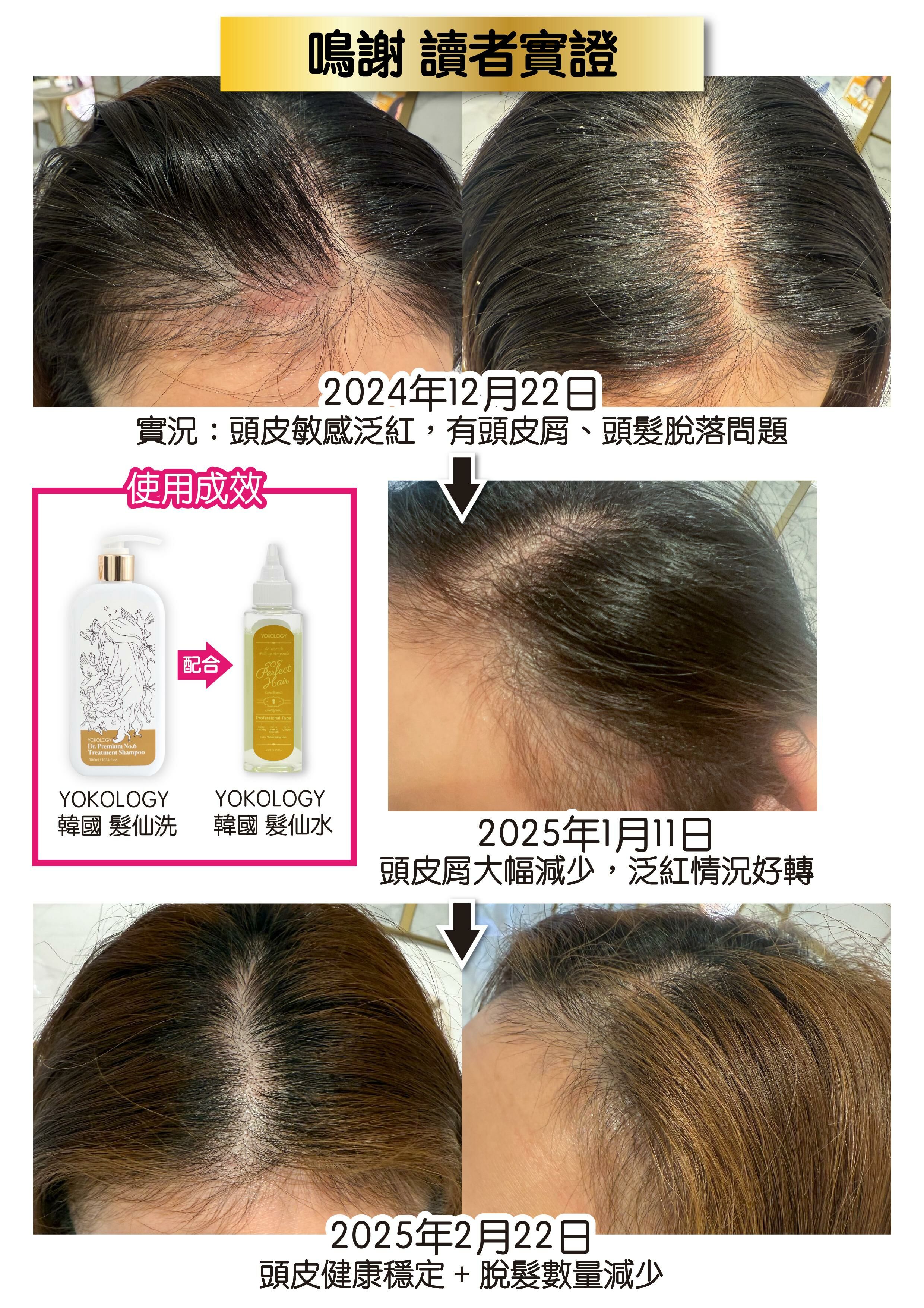 YOKOLOGY聯同韓國皮膚學博士攜手研創、韓國No.1 cGMP大廠生產的專業Salon保養級「髮仙洗」防脫育髮洗髮液,結合兩大獨特專利成份HP-DCC Complex及Moplex H,加上十多種天然草本植物配方,獲研究報告,發揮全方位保養頭皮和頭髮療效。
